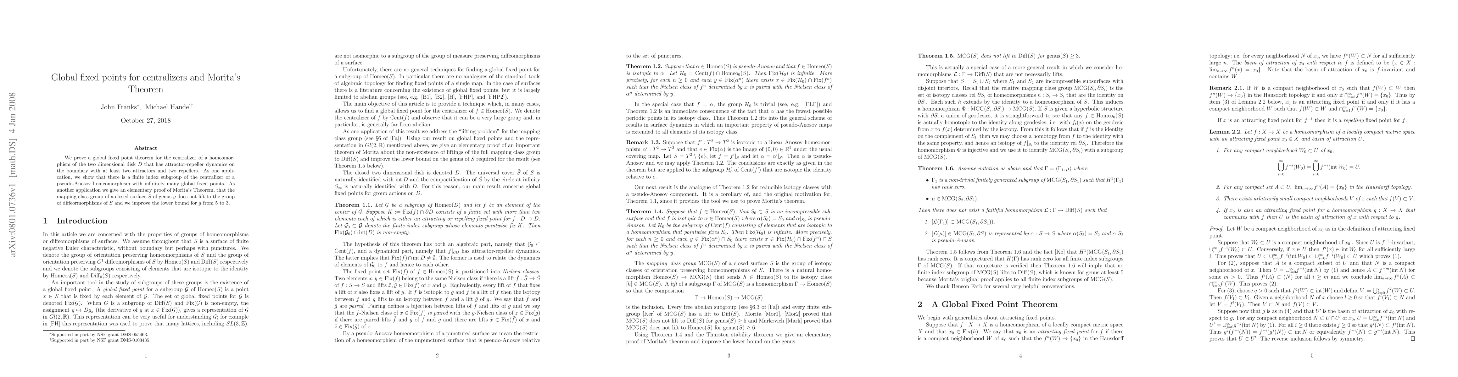 We prove a global fixed point theorem for the centralizer of a homeomorphism of the two dimensional disk $D$ that has attractor-repeller dynamics on the boundary with at least two attractors and two repellers. As one application, we show that there is a finite index subgroup of the centralizer of a pseudo-Anosov homeomorphism with infinitely many global fixed points. As another application we give an elementary proof of Morita's Theorem, that the mapping class group of a closed surface $S$ of genus $g$ does not lift to the group of diffeormorphisms of $S$ and we improve the lower bound for $g$ from 5 to 3.