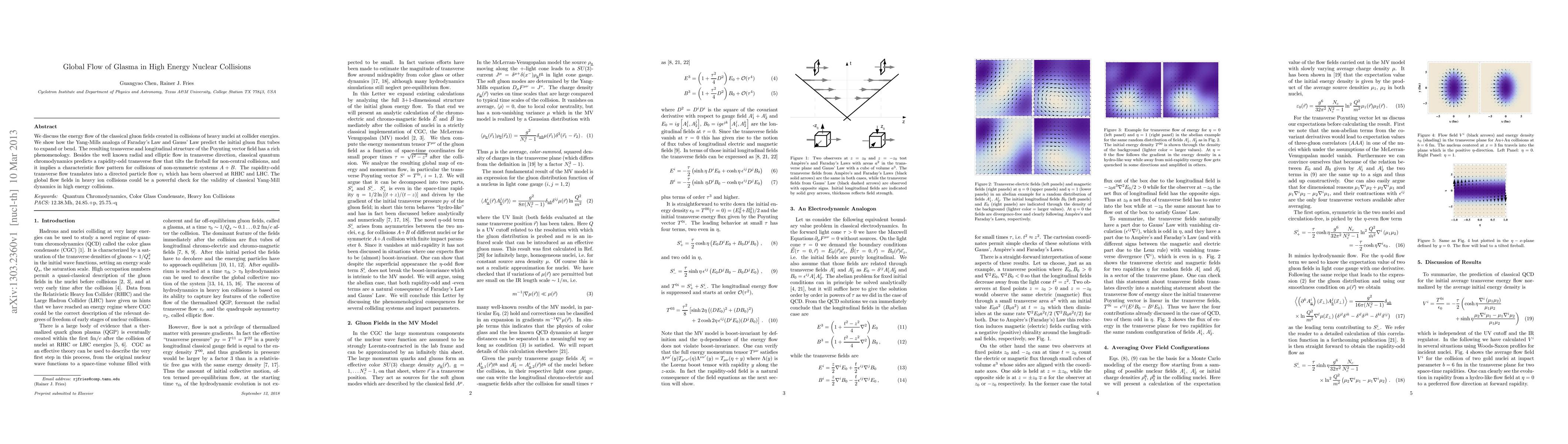 We discuss the energy flow of the classical gluon fields created in collisions of heavy nuclei at collider energies. We show how the Yang-Mills analoga of Faraday's Law and Gauss' Law predict the initial gluon flux tubes to expand or bend. The resulting transverse and longitudinal structure of the Poynting vector field has a rich phenomenology. Besides the well known radial and elliptic flow in transverse direction, classical quantum chromodynamics predicts a rapidity-odd transverse flow that tilts the fireball for non-central collisions, and it implies a characteristic flow pattern for collisions of non-symmetric systems $A+B$. The rapidity-odd transverse flow translates into a directed particle flow $v_1$ which has been observed at RHIC and LHC. The global flow fields in heavy ion collisions could be a powerful check for the validity of classical Yang-Mill dynamics in high energy collisions.