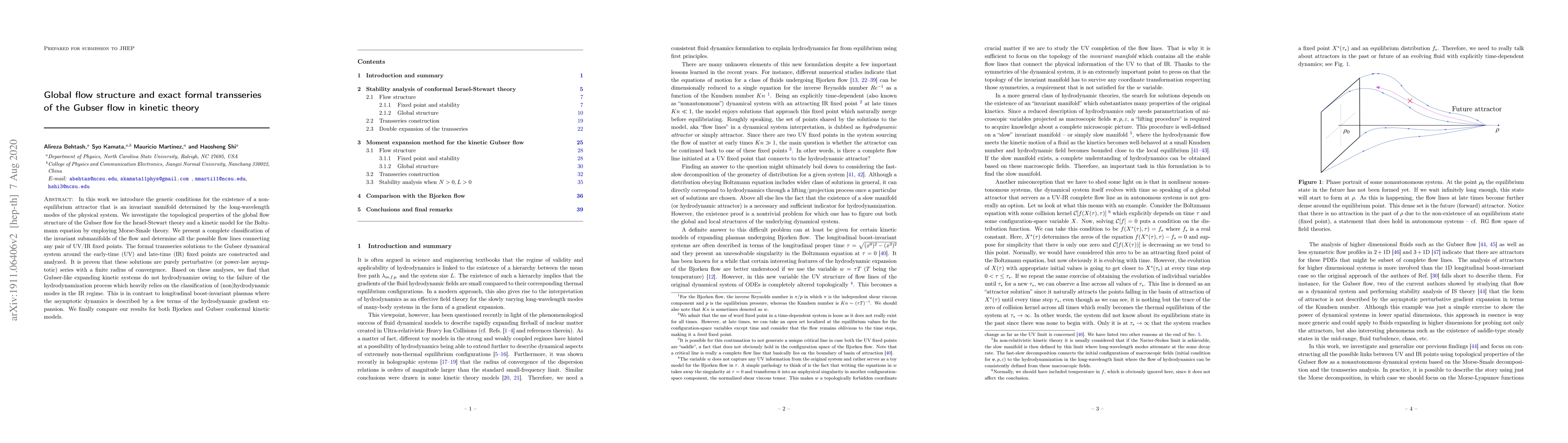 In this work we introduce the generic conditions for the existence of a non-equilibrium attractor that is an invariant manifold determined by the long-wavelength modes of the physical system. We investigate the topological properties of the global flow structure of the Gubser flow for the Israel-Stewart theory and a kinetic model for the Boltzmann equation by employing Morse-Smale theory. We present a complete classification of the invariant submanifolds of the flow and determine all the possible flow lines connecting any pair of UV/IR fixed points. The formal transseries solutions to the Gubser dynamical system around the early-time (UV) and late-time (IR) fixed points are constructed and analyzed. It is proven that these solutions are purely perturbative (or power-law asymptotic) series with a finite radius of convergence. Based on these analyses, we find that Gubser-like expanding kinetic systems do not hydrodynamize owing to the failure of the hydrodynamization process which heavily relies on the classification of (non)hydrodynamic modes in the IR regime. This is in contrast to longitudinal boost-invariant plasmas where the asymptotic dynamics is described by a few terms of the hydrodynamic gradient expansion. We finally compare our results for both Bjorken and Gubser conformal kinetic models.
