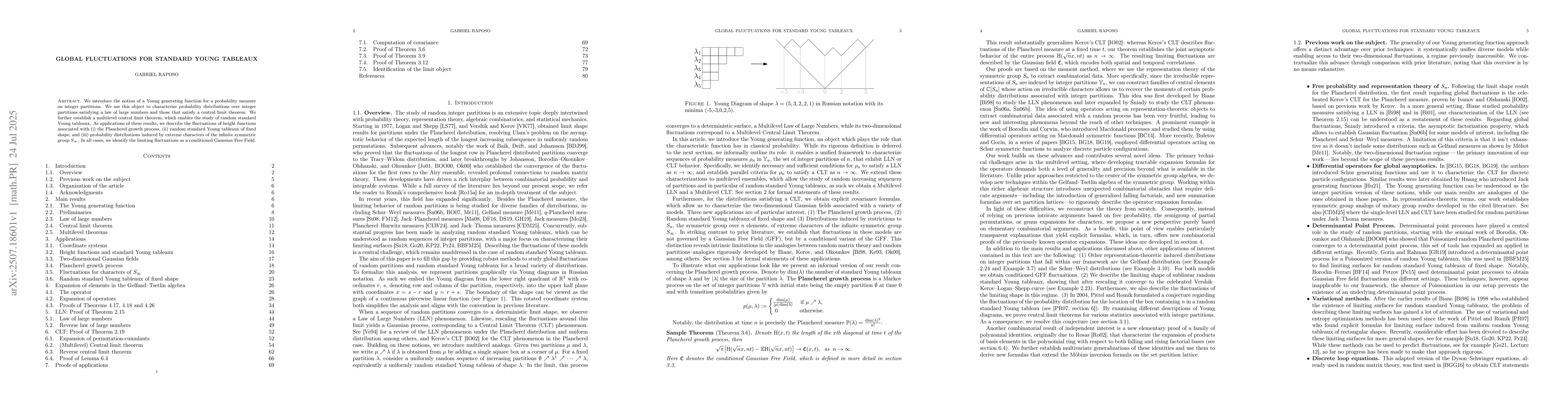 We introduce the notion of a Young generating function for a probability measure on integer partitions. We use this object to characterize probability distributions over integer partitions satisfying a law of large numbers and those that satisfy a central limit theorem. We further establish a multilevel central limit theorem, which enables the study of random standard Young tableaux. As applications of these results, we describe the fluctuations of height functions associated with (i) the Plancherel growth process, (ii) random standard Young tableaux of fixed shape, and (iii) probability distributions induced by extreme characters of the infinite symmetric group $S_\infty$. In all cases, we identify the limiting fluctuations as a conditioned Gaussian Free Field.