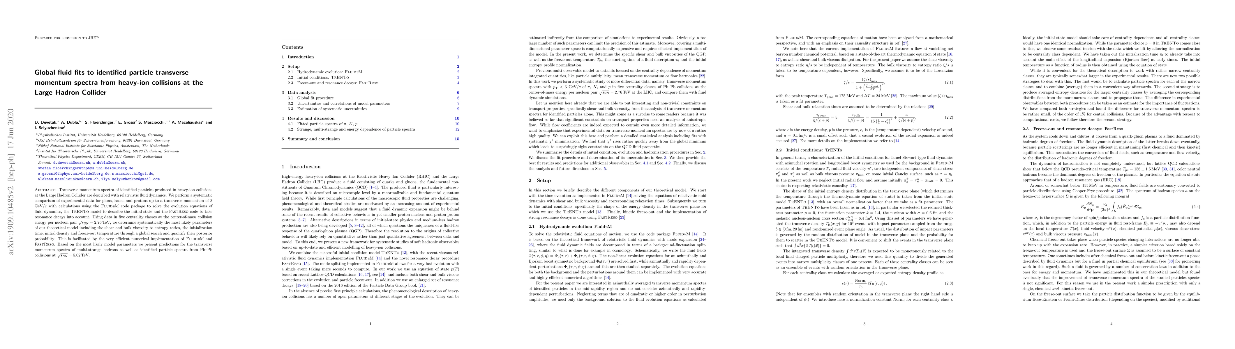 This paper uses relativistic fluid dynamics to model transverse momentum spectra of identified particles in heavy-ion collisions at the LHC, comparing experimental data with theoretical calculations. The study determines the most likely parameters of the model, including viscosity ratios, and provides predictions for future collisions at higher energies.