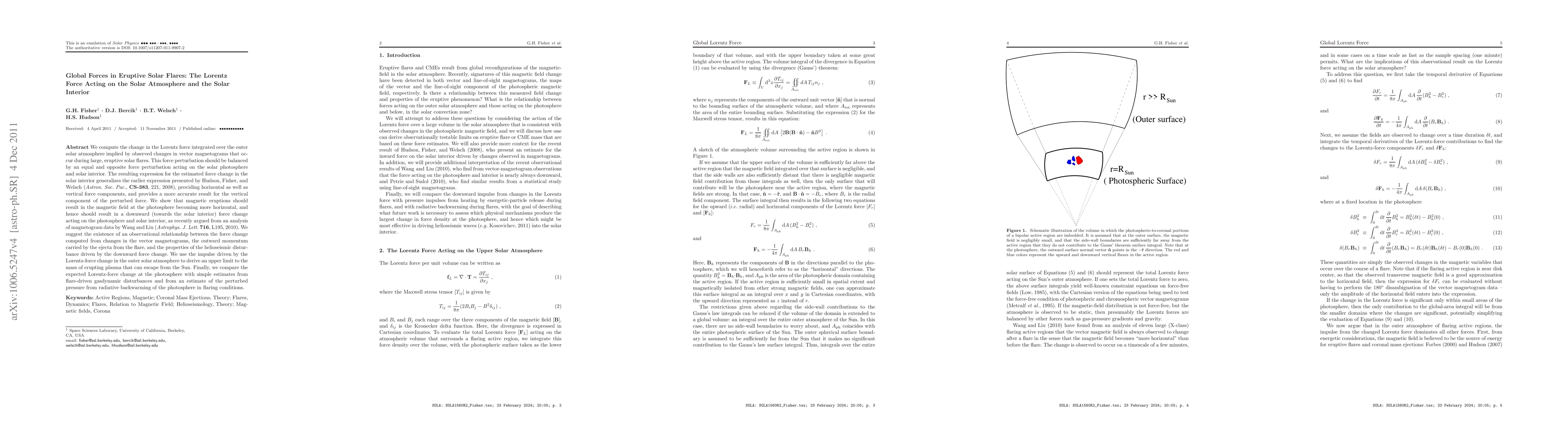 This paper computes the Lorentz force change in the solar atmosphere during eruptive flares, showing that magnetic eruptions lead to a more horizontal magnetic field and a downward force change in the solar interior. It also suggests an observational link between this force change, flare ejecta momentum, and helioseismic disturbances, and provides an upper limit on escaping plasma mass.