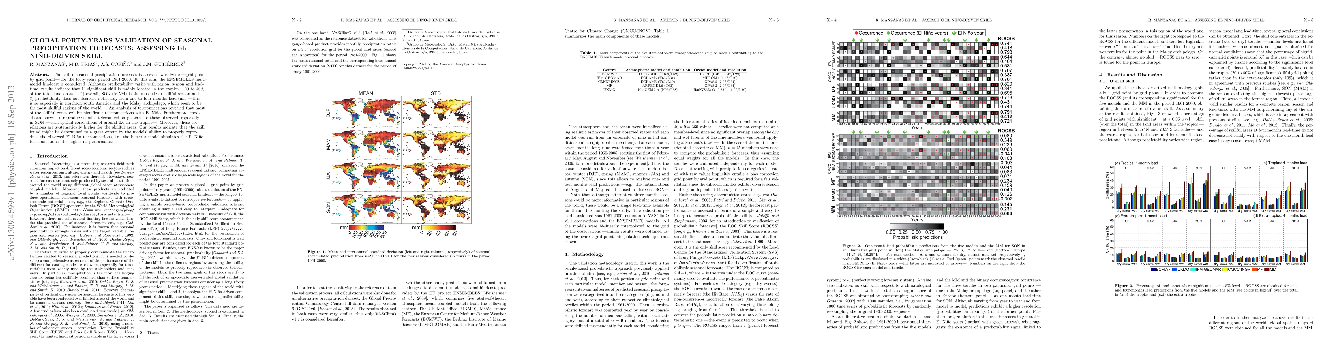 This paper evaluates the skill of seasonal precipitation forecasts globally over the 1961-2000 period, finding significant skill mainly in tropical regions. The study highlights that the models' ability to reproduce El Niño teleconnections strongly correlates with forecast skill, indicating that El Niño-driven predictability is a key factor in seasonal precipitation forecasts.