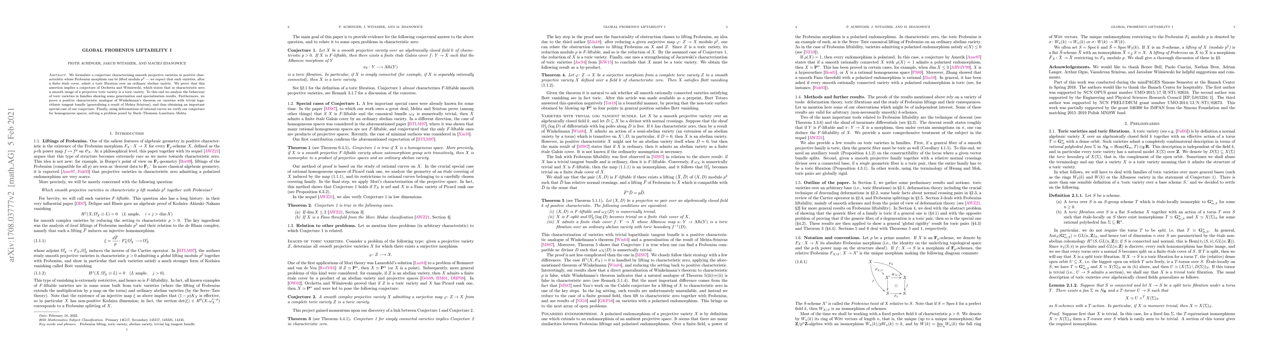 The paper presents a conjecture on lifting Frobenius morphisms of smooth projective varieties in positive characteristic, linked to toric fibrations over ordinary abelian varieties. Proofs include generization and specialization results for toric varieties, a positive characteristic version of Winkelmann's theorem, and verification for homogeneous spaces, solving a problem posed by Buch-Thomsen-Lauritzen-Mehta.