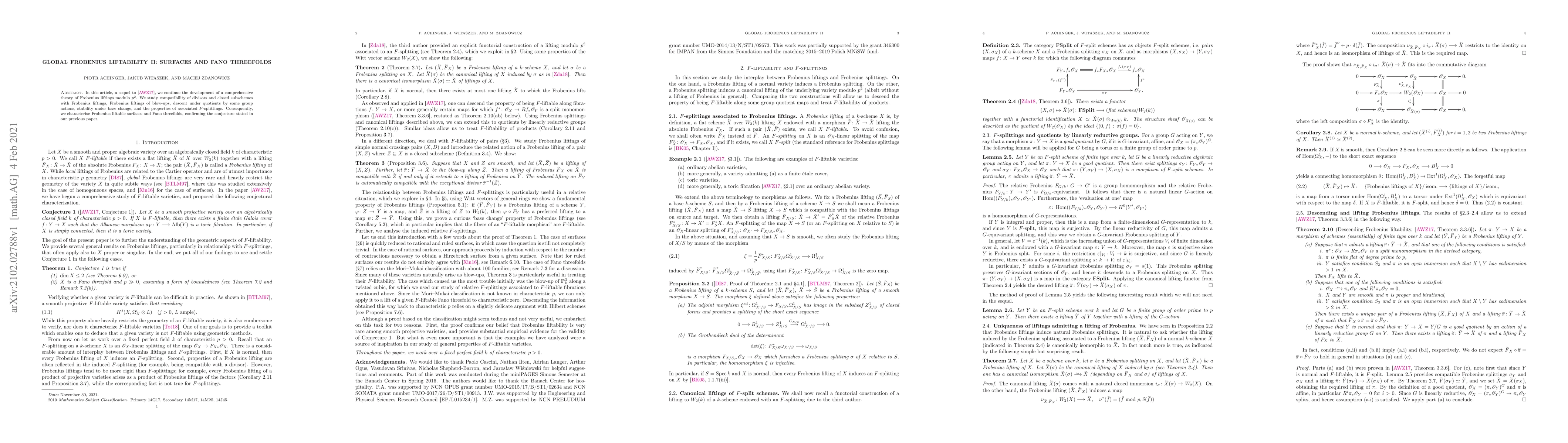Researchers studied Frobenius liftings on surfaces and Fano threefolds, characterizing which ones can be lifted and confirming a conjecture about their compatibility with certain divisor properties.