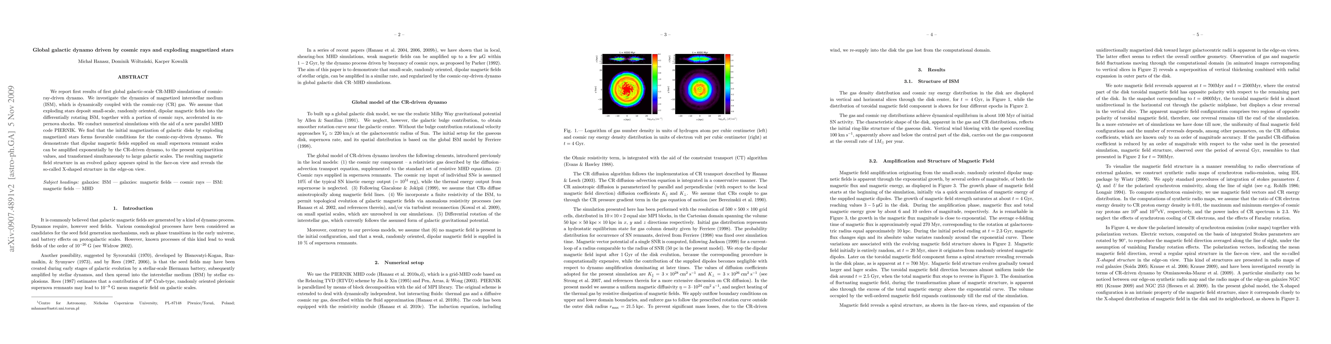We report first results of first global galactic-scale CR-MHD simulations of cosmic-ray-driven dynamo. We investigate the dynamics of magnetized interstellar medium (ISM), which is dynamically coupled with the cosmic-ray (CR) gas. We assume that exploding stars deposit small-scale, randomly oriented, dipolar magnetic fields into the differentially rotating ISM, together with a portion of cosmic rays, accelerated in supernova shocks. We conduct numerical simulations with the aid of a new parallel MHD code PIERNIK. We find that the initial magnetization of galactic disks by exploding magnetized stars forms a favourable conditions for the cosmic-ray-driven dynamo. We demonstrate that dipolar magnetic fields supplied on small SN-remnant scales, can be amplified exponentially, by the CR-driven dynamo, to the present equipartition values, and transformed simultaneously to large galactic-scales. The resulting magnetic field structure in an evolved galaxy appears spiral in the face-on view and reveals the so called X-shaped structure in the edge-on view.
