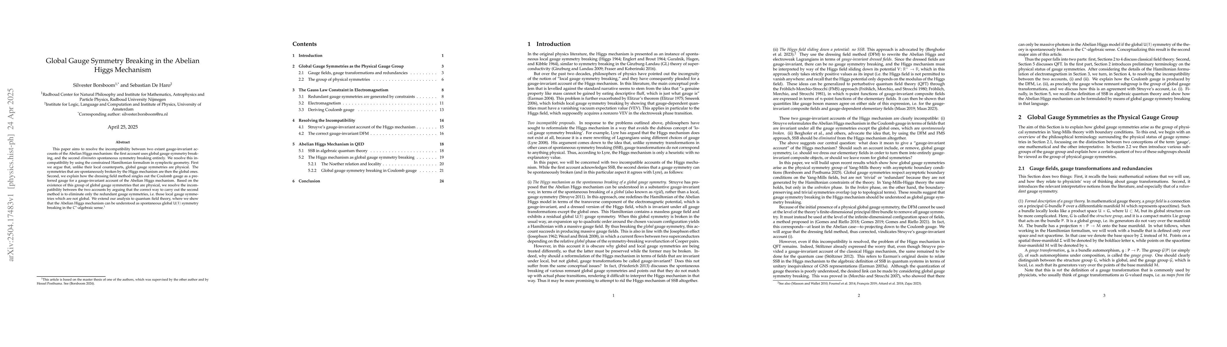 This paper reconciles two gauge-invariant interpretations of the Abelian Higgs mechanism by asserting that global gauge symmetries are physical and can be spontaneously broken, while redundant local gauge symmetries are eliminated. It uses the constrained Hamiltonian formalism to demonstrate that the Coulomb gauge is preferred and extends the analysis to quantum field theory.