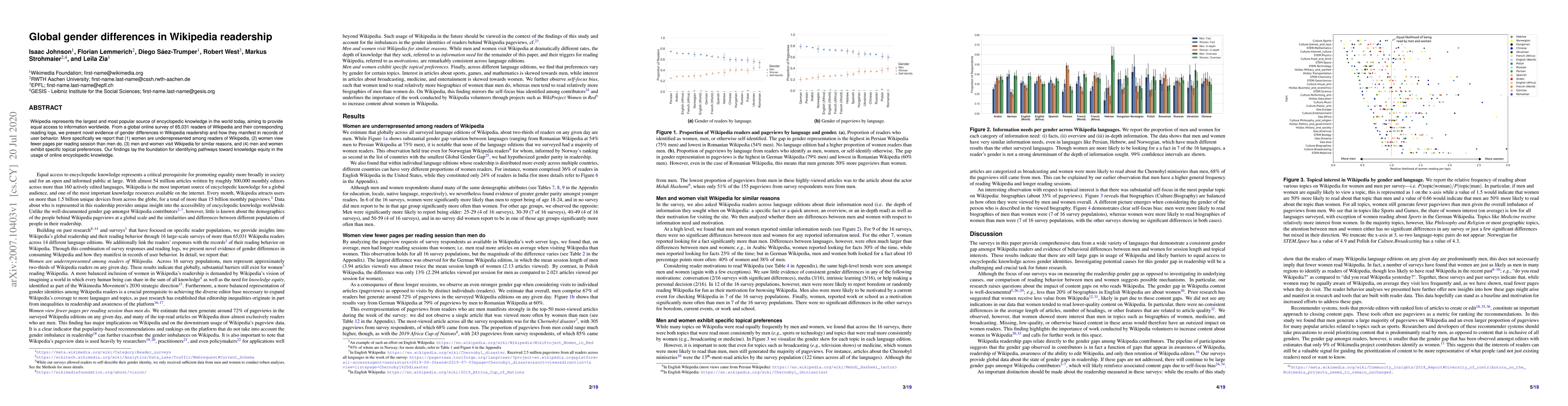 This study reveals significant gender disparities in Wikipedia readership, showing women are underrepresented, view fewer pages per session, and have distinct topical preferences, while both genders visit for similar reasons. These insights are crucial for promoting equitable access to online encyclopedic knowledge.