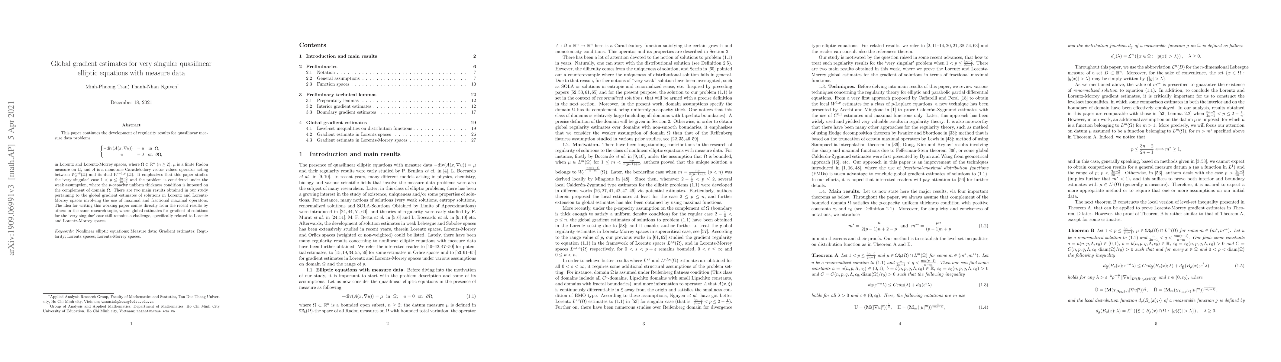The paper introduces novel techniques for handling singular quasilinear elliptic equations with measure data, particularly focusing on gradient estimates in Lorentz and Lorentz-Morrey spaces.