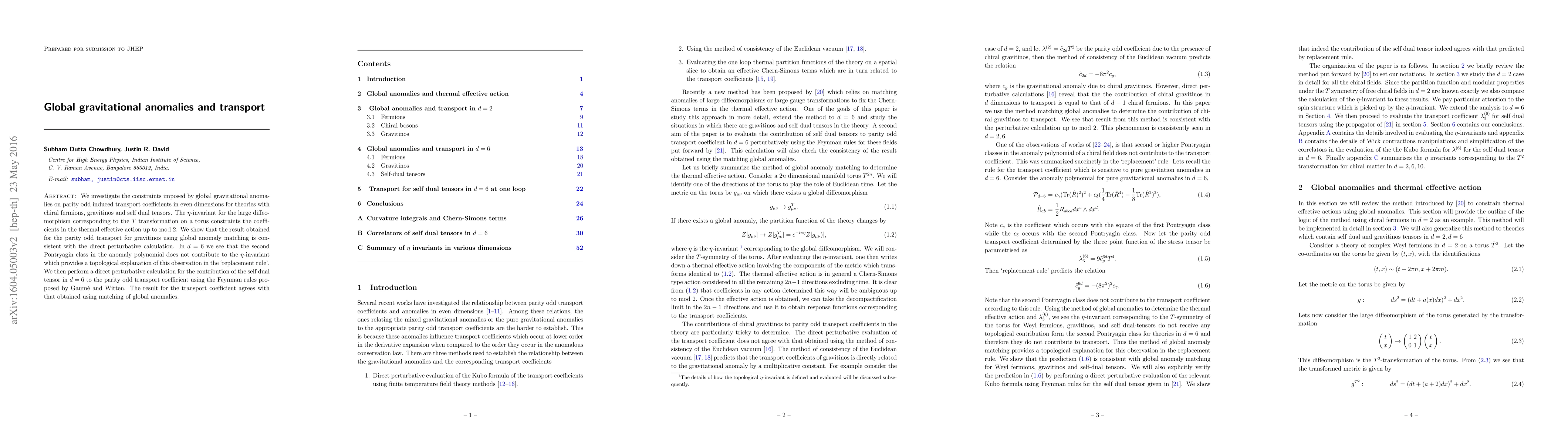 This paper examines how global gravitational anomalies constrain parity odd induced transport coefficients in even-dimensional theories with chiral fermions, gravitinos, and self-dual tensors. It finds that the $\eta$-invariant for large diffeomorphisms constrains these coefficients up to mod 2, and confirms consistency between global anomaly matching and direct perturbative calculations for gravitino transport.