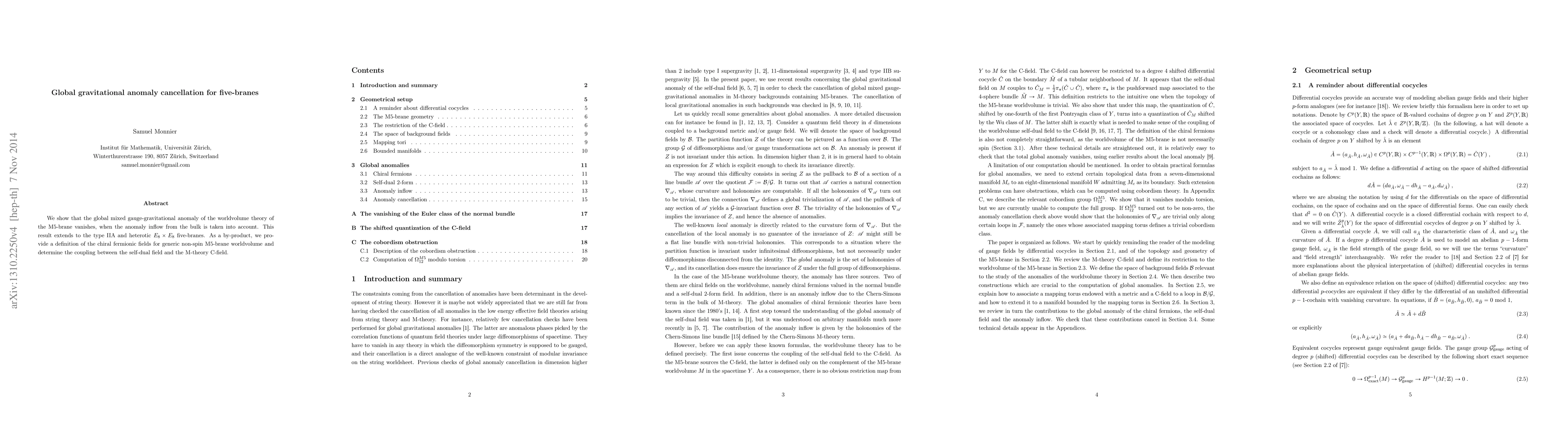 We show that the global mixed gauge-gravitational anomaly of the worldvolume theory of the M5-brane vanishes, when the anomaly inflow from the bulk is taken into account. This result extends to the type IIA and heterotic $E_8 \times E_8$ five-branes. As a by-product, we provide a definition of the chiral fermionic fields for generic non-spin M5-brane worldvolume and determine the coupling between the self-dual field and the M-theory C-field.