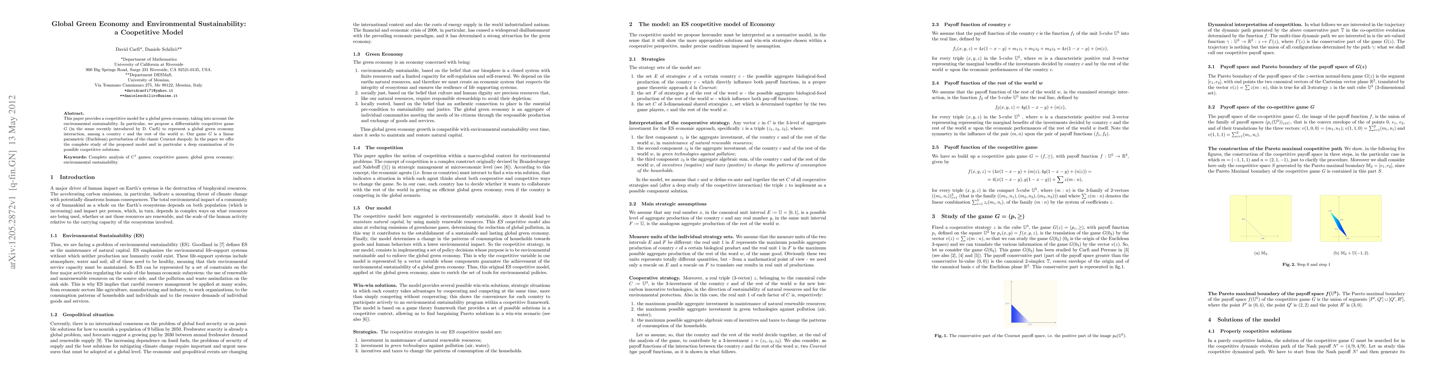 This paper introduces a coopetitive model, game G, for a global green economy, combining environmental sustainability with the interaction between a country and the rest of the world. The model is a linear perturbation of the classic Cournot duopoly and explores its potential cooperative and competitive solutions.