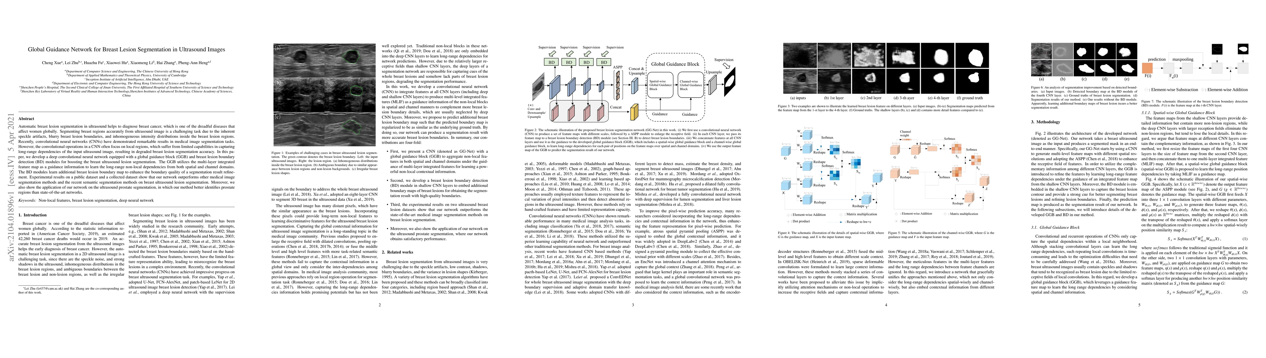 This paper proposes a deep convolutional neural network with a global guidance block and breast lesion boundary detection modules to enhance breast lesion segmentation in ultrasound images. The network outperforms other segmentation methods in detecting breast lesions and also shows better performance in prostate segmentation.