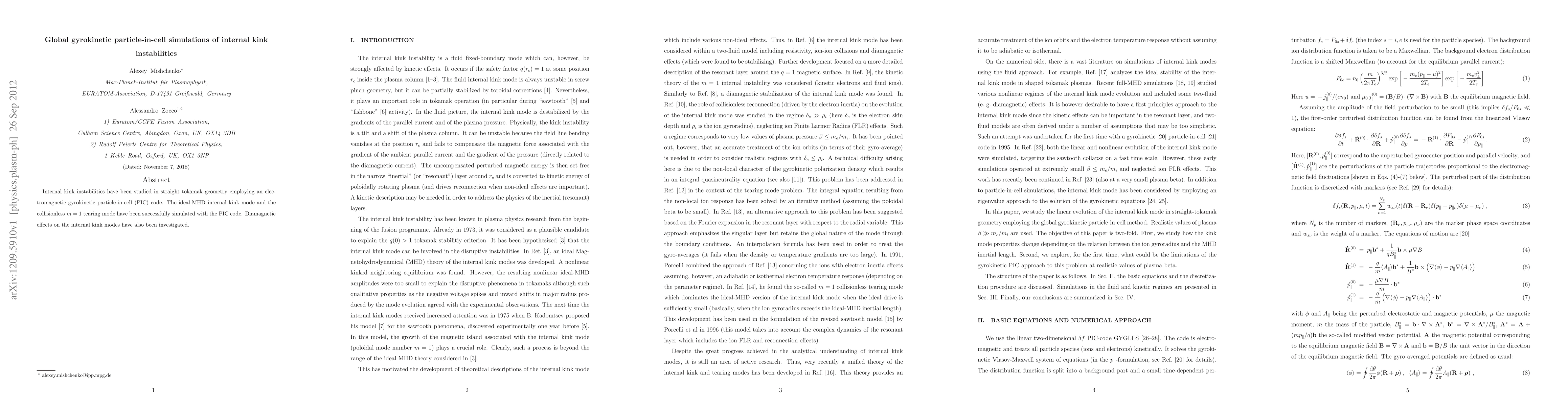 This paper employs an electromagnetic gyrokinetic particle-in-cell code to simulate internal kink instabilities in straight tokamak geometry, successfully modeling both ideal-MHD internal kink modes and collisionless tearing modes, and investigating diamagnetic effects on these instabilities.