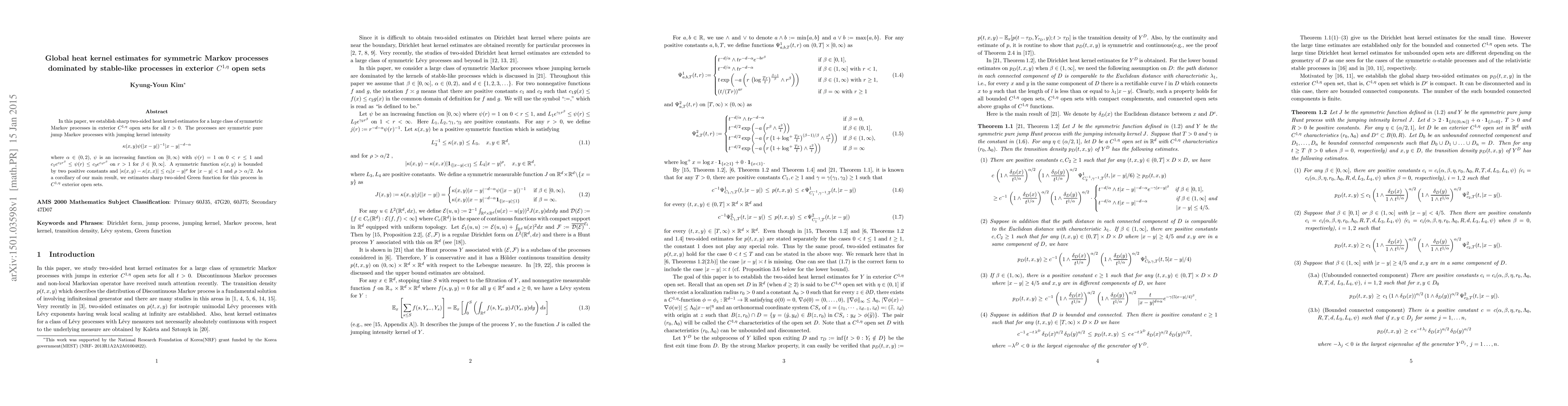 This paper establishes sharp two-sided heat kernel estimates for symmetric Markov processes dominated by stable-like processes in exterior $C^{1,\eta}$ open sets. The processes have a specific jumping kernel intensity and the authors derive estimates for both the heat kernel and the Green function.