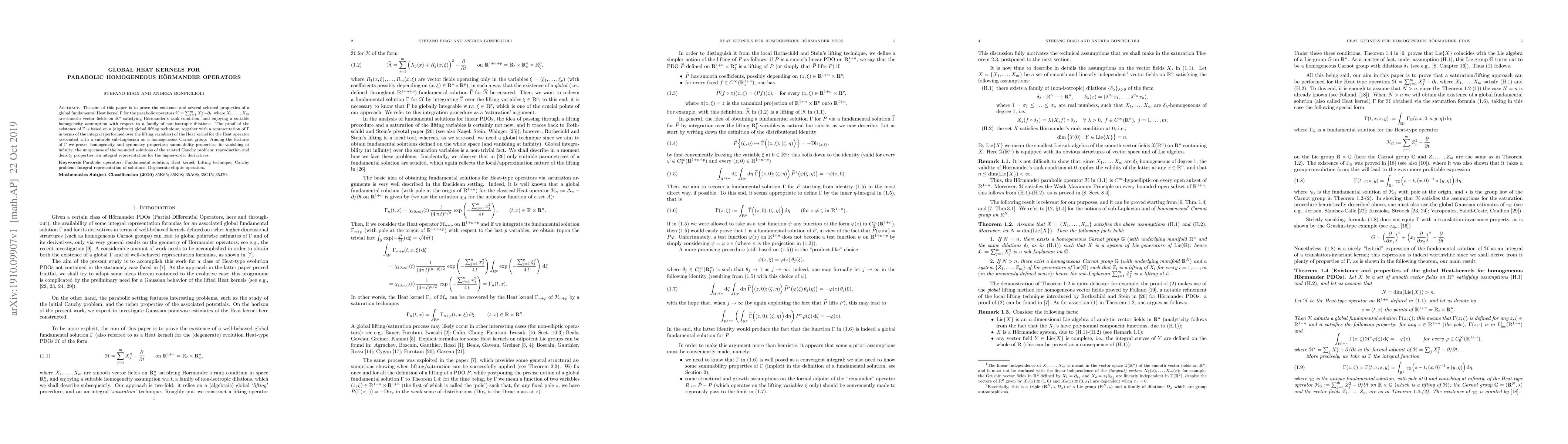 The aim of this paper is to prove the existence and several selected properties of a global fundamental Heat kernel $\Gamma$ for the parabolic operators $\mathcal{H}=\sum_{j=1}^m X_j^2-\partial_t$, where $X_1,\ldots,X_m$ are smooth vector fields on $\mathbb{R}^n$ satisfying H\"ormander'snrank condition, and enjoying a suitable homogeneity assumption with respect to a family of non-isotropic dilations. The proof of the existence of $\Gamma$ is based on a (algebraic) global lifting technique, together with a representation of $\Gamma$ in terms of the integral (performed over the lifting variables) of the Heat kernel for the Heat operator associated with a suitable sub-Laplacian on a homogeneous Carnot group. Among the features of $\Gamma$ we prove: homogeneity and symmetry properties; summability properties; its vanishing at infinity; the uniqueness of the bounded solutions of the related Cauchy problem; reproduction and density properties; an integral representation for the higher-order derivatives.