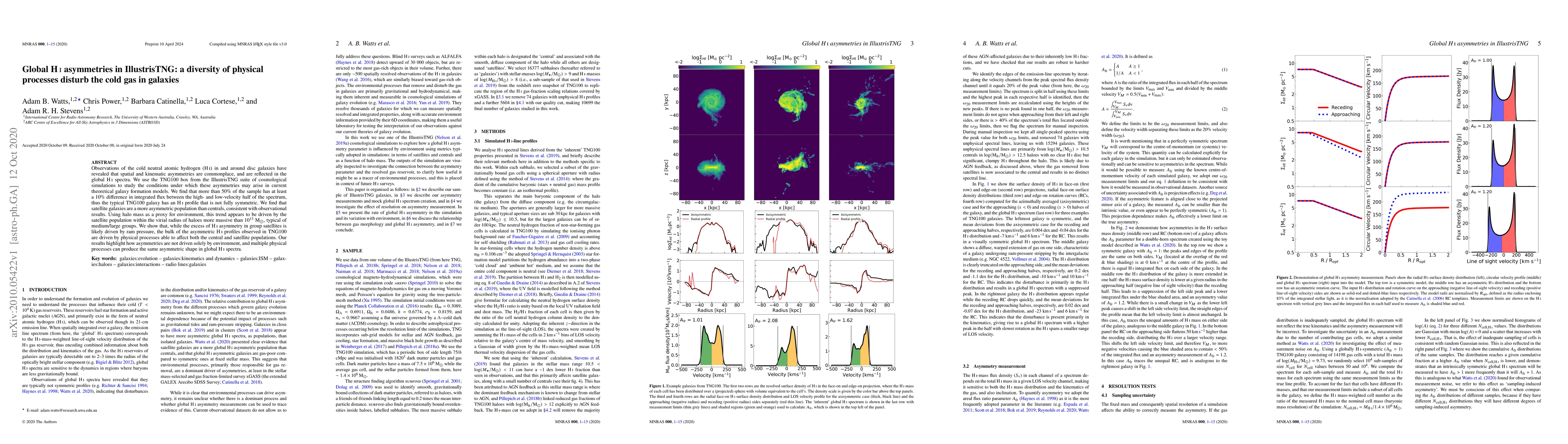 Observations of the cold neutral atomic hydrogen (HI) in and around disc galaxies have revealed that spatial and kinematic asymmetries are commonplace, and are reflected in the global HI spectra. We use the TNG100 box from the IllustrisTNG suite of cosmological simulations to study the conditions under which these asymmetries may arise in current theoretical galaxy formation models. We find that more than 50% of the sample has at least a 10% difference in integrated flux between the high- and low-velocity half of the spectrum, thus the typical TNG100 galaxy has an HI profile that is not fully symmetric. We find that satellite galaxies are a more asymmetric population than centrals, consistent with observational results. Using halo mass as a proxy for environment, this trend appears to be driven by the satellite population within the virial radius of haloes more massive than $10^{13} M_{\odot}$, typical of medium/large groups. We show that, while the excess of HI asymmetry in group satellites is likely driven by ram pressure, the bulk of the asymmetric HI profiles observed in TNG100 are driven by physical processes able to affect both the central and satellite populations. Our results highlight how asymmetries are not driven solely by environment, and multiple physical processes can produce the same asymmetric shape in global HI spectra.