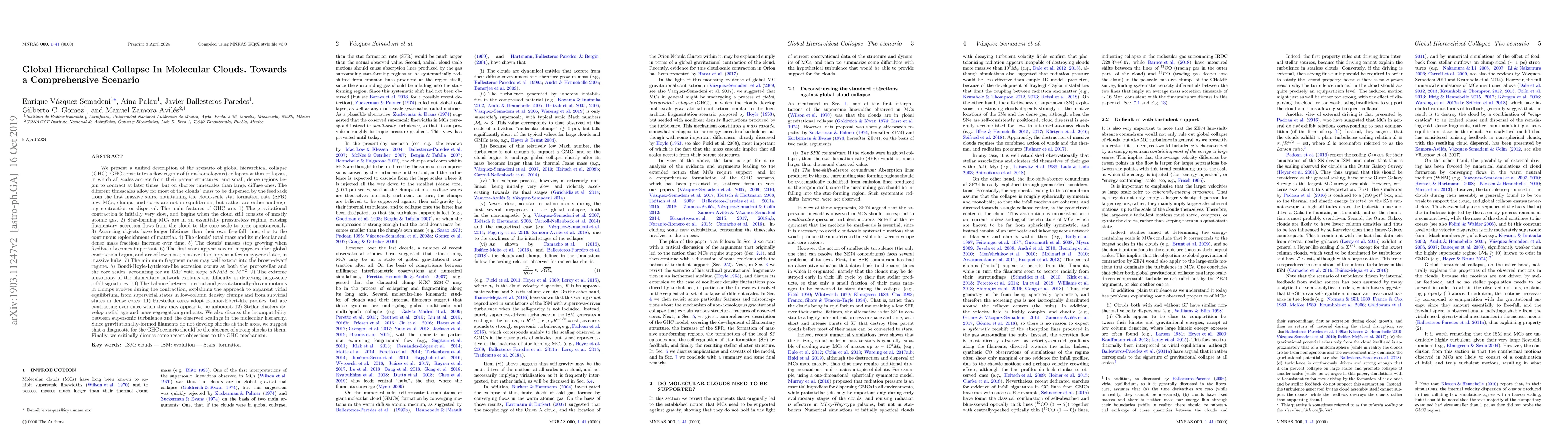 This paper presents a comprehensive scenario of Global Hierarchical Collapse (GHC) in molecular clouds, detailing how successive collapses at different scales lead to star formation, with feedback from massive stars dispersing most of the cloud's mass and maintaining low global star formation rates. The study highlights the pressureless regime, filamentary accretion, and the development of radial age and mass segregation in stellar clusters.
