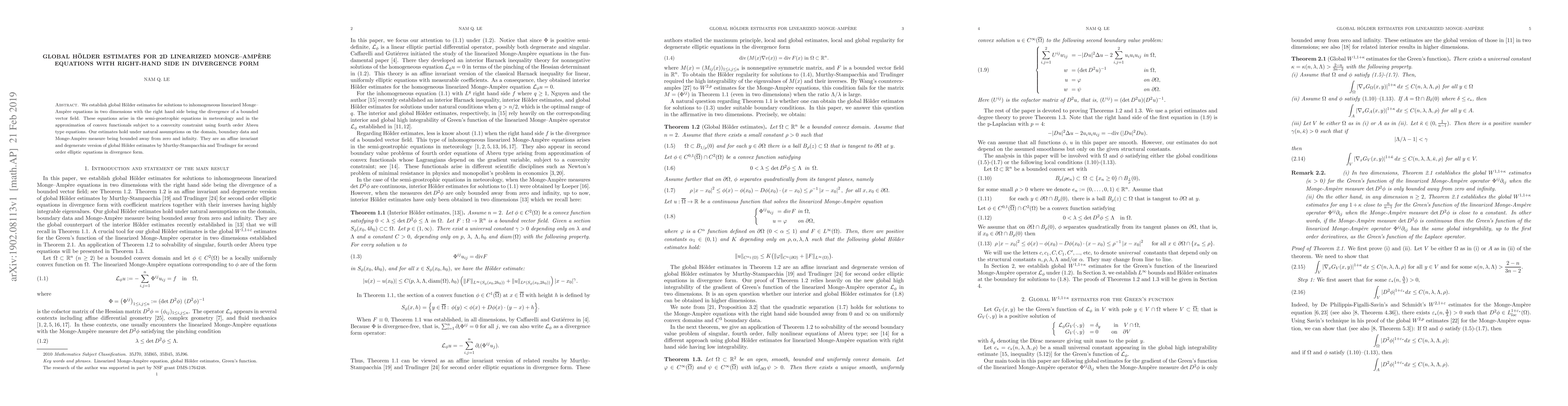 We establish global H\"older estimates for solutions to inhomogeneous linearized Monge-Amp\`ere equations in two dimensions with the right hand side being the divergence of a bounded vector field. These equations arise in the semi-geostrophic equations in meteorology and in the approximation of convex functionals subject to a convexity constraint using fourth order Abreu type equations. Our estimates hold under natural assumptions on the domain, boundary data and Monge-Amp\`ere measure being bounded away from zero and infinity. They are an affine invariant and degenerate version of global H\"older estimates by Murthy-Stampacchia and Trudinger for second order elliptic equations in divergence form.