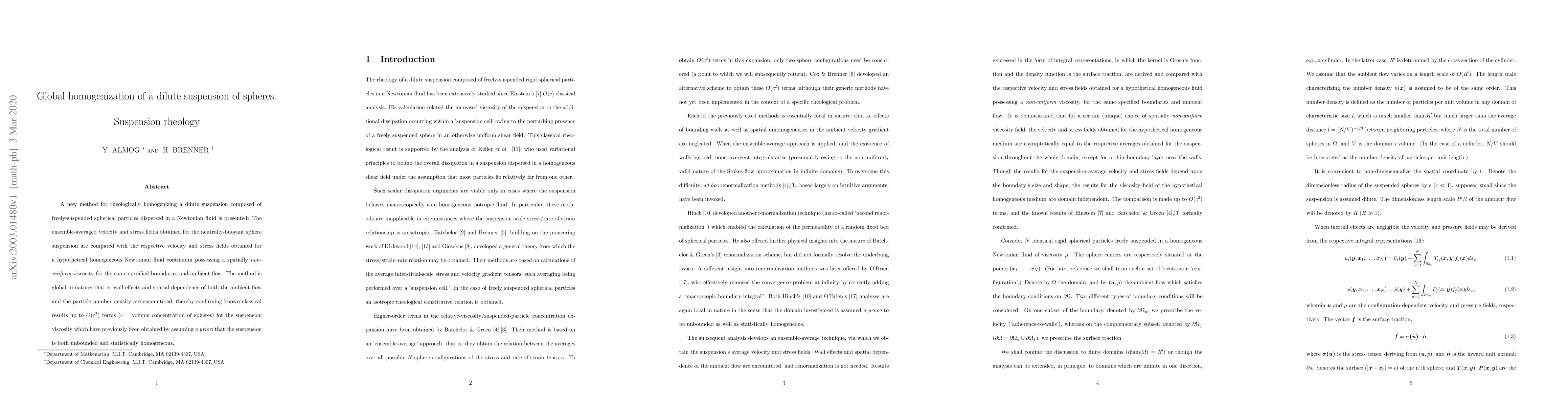 The paper introduces a novel global homogenization method for dilute sphere suspensions, providing a detailed comparison between the suspension and a hypothetical homogeneous fluid with non-uniform viscosity.