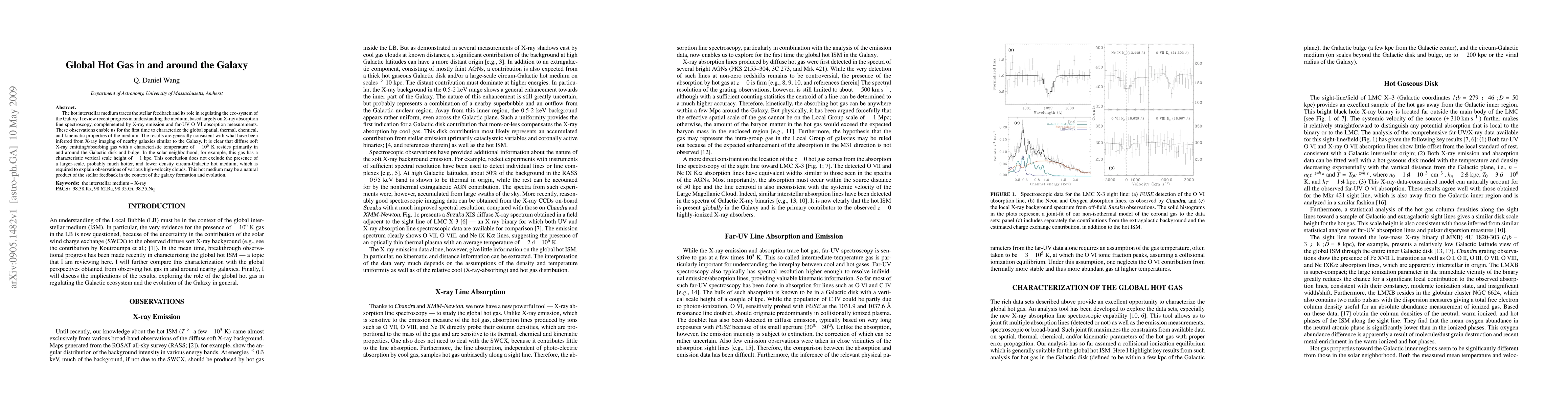 The hot interstellar medium traces the stellar feedback and its role in regulating the eco-system of the Galaxy. I review recent progress in understanding the medium, based largely on X-ray absorption line spectroscopy, complemented by X-ray emission and far-UV OVI absorption measurements. These observations enable us for the first time to characterize the global spatial, thermal, chemical, and kinematic properties of the medium. The results are generally consistent with what have been inferred from X-ray imaging of nearby galaxies similar to the Galaxy. It is clear that diffuse soft X-ray emitting/absorbing gas with a characteristic temperature of $\sim 10^6$ K resides primarily in and around the Galactic disk and bulge. In the solar neighborhood, for example, this gas has a characteristic vertical scale height of $\sim 1$ kpc. This conclusion does not exclude the presence of a larger-scale, probably much hotter, and lower density circum-Galactic hot medium, which is required to explain observations of various high-velocity clouds. This hot medium may be a natural product of the stellar feedback in the context of the galaxy formation and evolution.