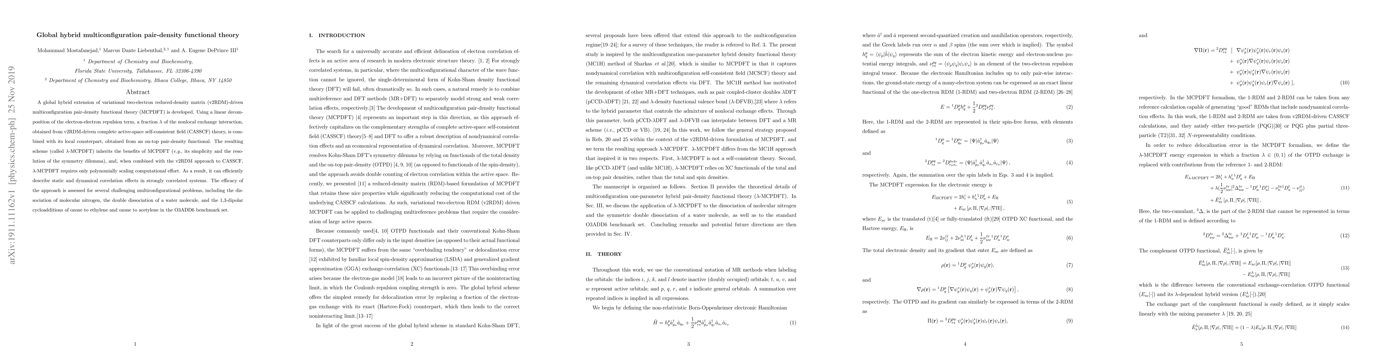 The paper introduces a global hybrid multiconfiguration pair-density functional theory (λ-MCPDFT) combining nonlocal and local exchange interactions to efficiently describe correlation effects in strongly correlated systems. The method shows promising results in challenging multiconfigurational problems like the dissociation of molecular nitrogen and the O3ADD6 benchmark set reactions.