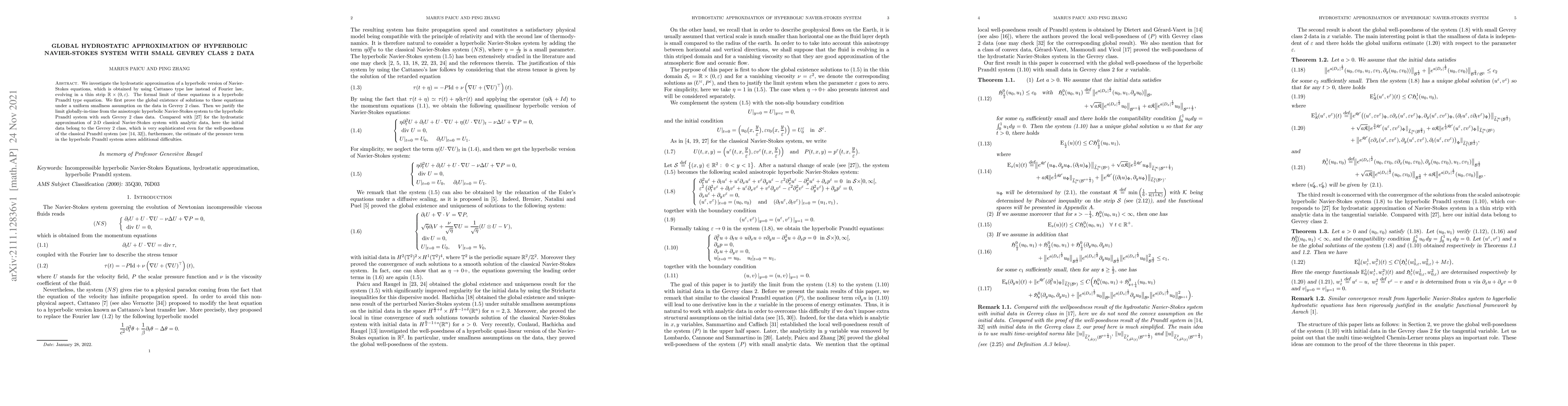 This paper studies the global hydrostatic approximation of a hyperbolic version of the Navier-Stokes equations using a Cattaneo type law. It proves global existence of solutions under smallness assumptions on Gevrey class 2 data and justifies the limit from the hyperbolic Navier-Stokes to the hyperbolic Prandtl system globally in time.
