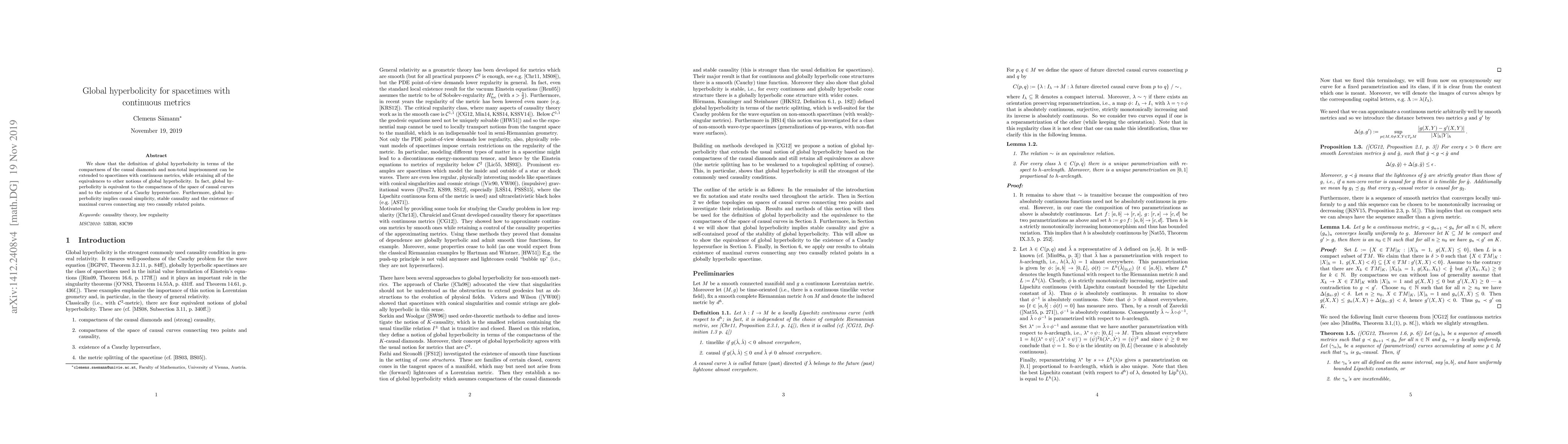 This paper extends the concept of global hyperbolicity to spacetimes with continuous metrics, demonstrating its equivalence to compactness of causal diamonds and the existence of Cauchy hypersurfaces, while maintaining causal simplicity, stable causality, and maximal curves.