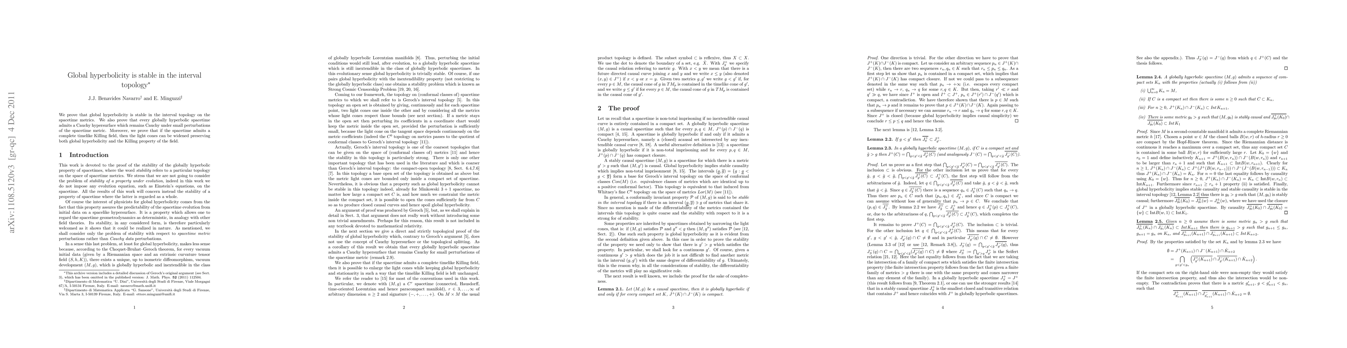 This paper demonstrates the stability of global hyperbolicity in the interval topology of spacetime metrics and shows that globally hyperbolic spacetimes maintain Cauchy hypersurfaces under minor metric perturbations. Additionally, it proves that spacetimes with complete timelike Killing fields can widen their light cones while preserving global hyperbolicity and the Killing field's properties.