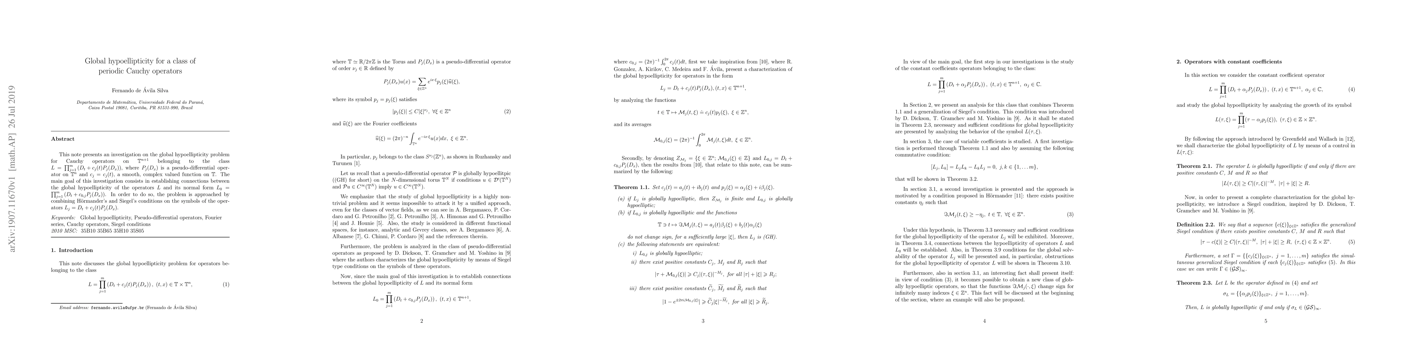 This note presents an investigation on the global hypoellipticity problem for Cauchy operators on $\mathbb{T}^{n+1}$ belonging to the class \linebreak $L = \prod_{j=1}^{m}\left(D_t + c_j(t) P_j(D_x)\right)$, where $P_j(D_x)$ is a pseudo-differential operator on $\mathbb{T}^n$ and $c_j = c_j(t)$, a smooth, complex valued function on $\mathbb{T}$. The main goal of this investigation consists in establishing connections between the global hypoellipticity of the operators $L$ and its normal form $L_0 = \prod_{j=1}^m \left( D_t + c_{0,j}P_j(D_x)\right)$. In order to do so, the problem is approached by combining H\"{o}rmander's and Siegel's conditions on the symbols of the operators $L_j = D_t + c_j(t) P_j(D_x)$.