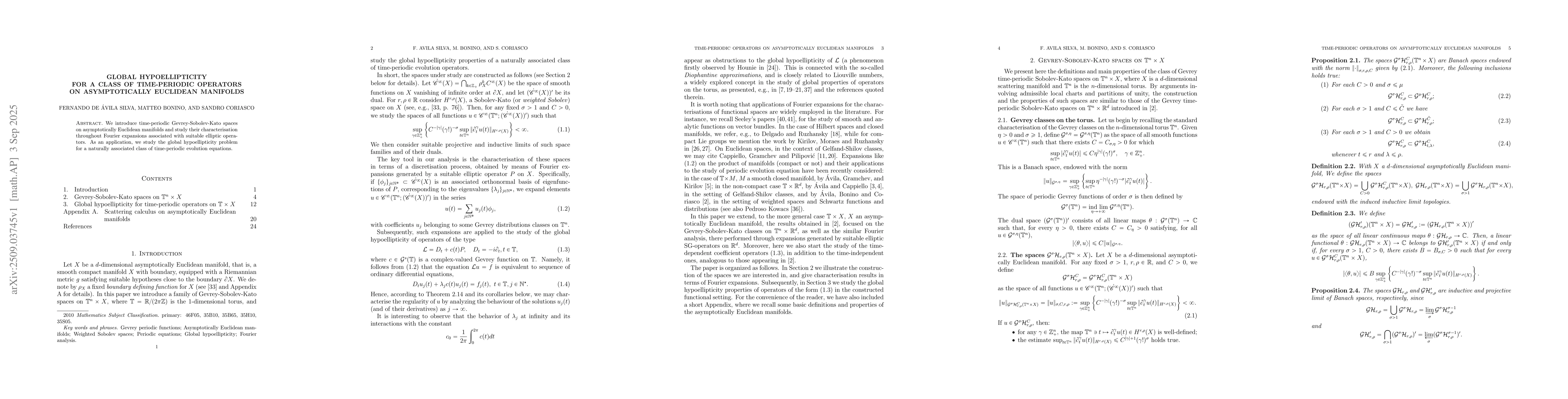 We introduce time-periodic Gevrey-Sobolev-Kato spaces on asymptotically Euclidean manifolds and study their characterisation throughout Fourier expansions associated with suitable elliptic operators. As an application, we study the global hypoellipticity problem for a naturally associated class of time-periodic evolution equations.