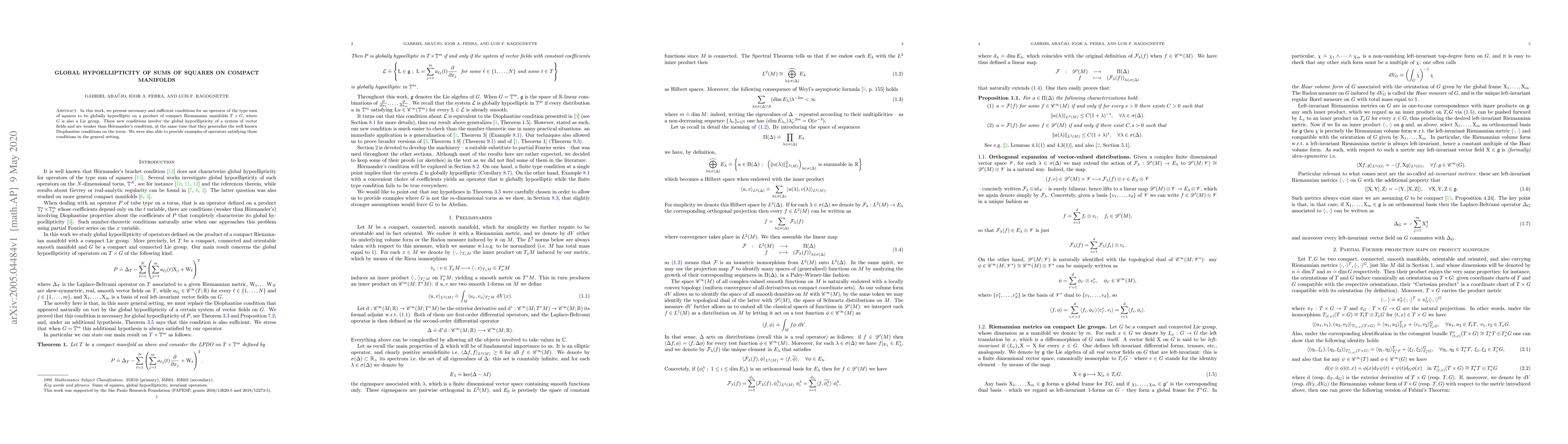 New conditions for global hypoellipticity of sums of squares on compact manifolds have been established, providing a general framework for understanding the behavior of certain operators on product spaces of Lie groups.