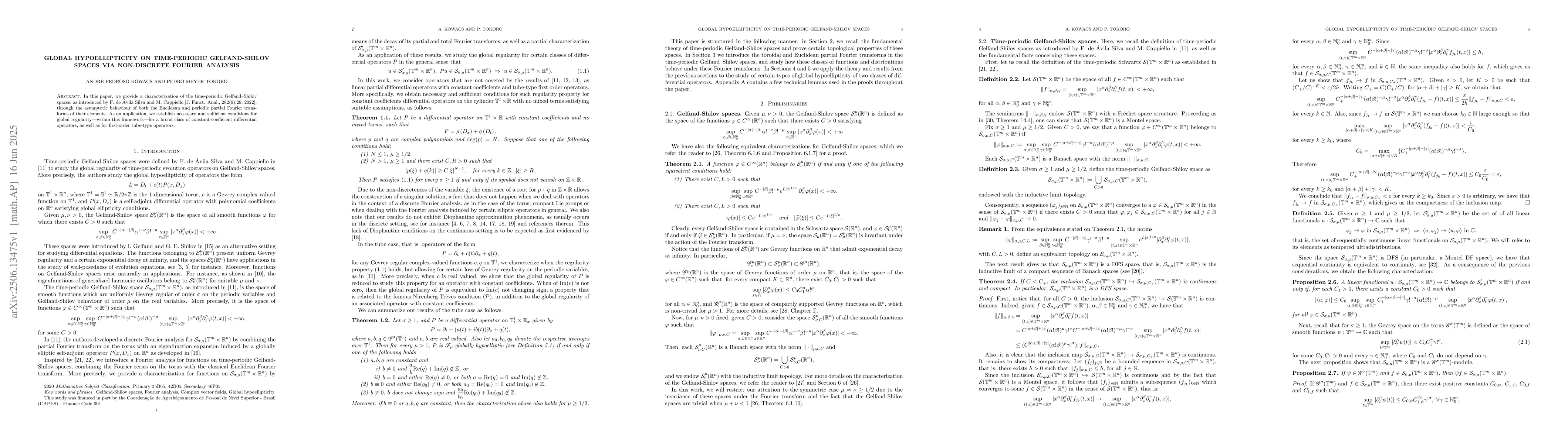 This paper characterizes time-periodic Gelfand-Shilov spaces using Fourier transform behavior. It then applies this characterization to establish global regularity conditions for various differential operators.