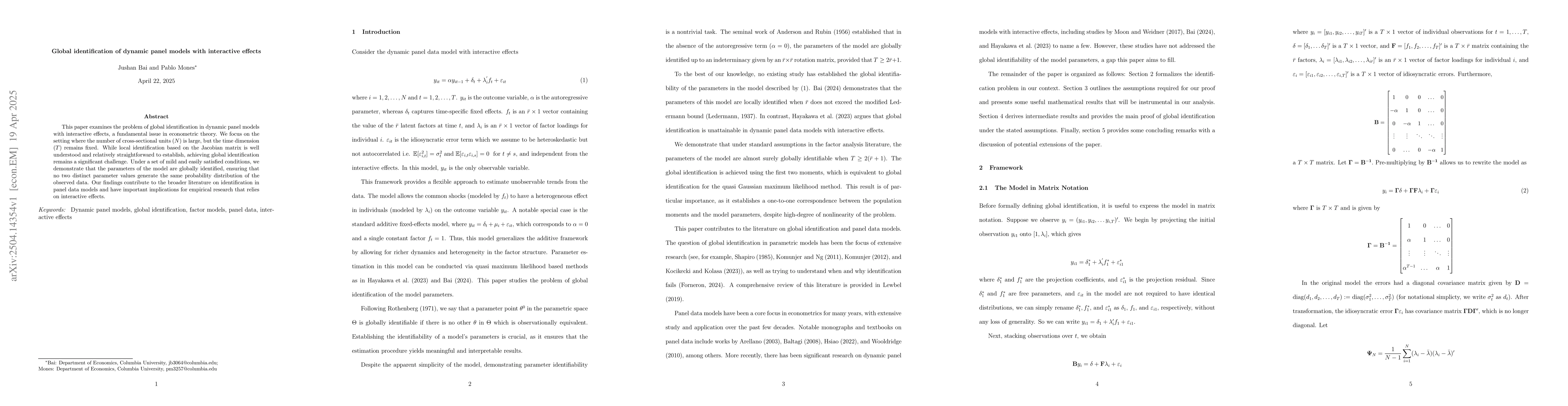 The paper demonstrates global identification of dynamic panel models with interactive effects, extending previous work by showing that under certain conditions, a one-to-one correspondence exists between population moments and model parameters.