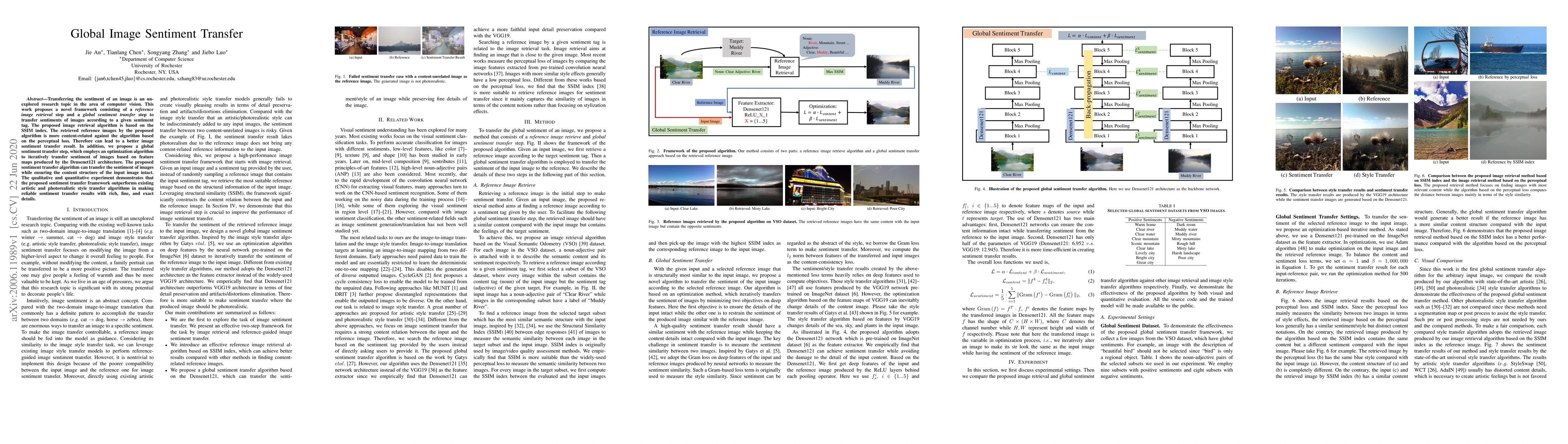 Transferring the sentiment of an image is an unexplored research topic in the area of computer vision. This work proposes a novel framework consisting of a reference image retrieval step and a global sentiment transfer step to transfer sentiments of images according to a given sentiment tag. The proposed image retrieval algorithm is based on the SSIM index. The retrieved reference images by the proposed algorithm are more content-related against the algorithm based on the perceptual loss. Therefore can lead to a better image sentiment transfer result. In addition, we propose a global sentiment transfer step, which employs an optimization algorithm to iteratively transfer sentiment of images based on feature maps produced by the Densenet121 architecture. The proposed sentiment transfer algorithm can transfer the sentiment of images while ensuring the content structure of the input image intact. The qualitative and quantitative experiments demonstrate that the proposed sentiment transfer framework outperforms existing artistic and photorealistic style transfer algorithms in making reliable sentiment transfer results with rich and exact details.