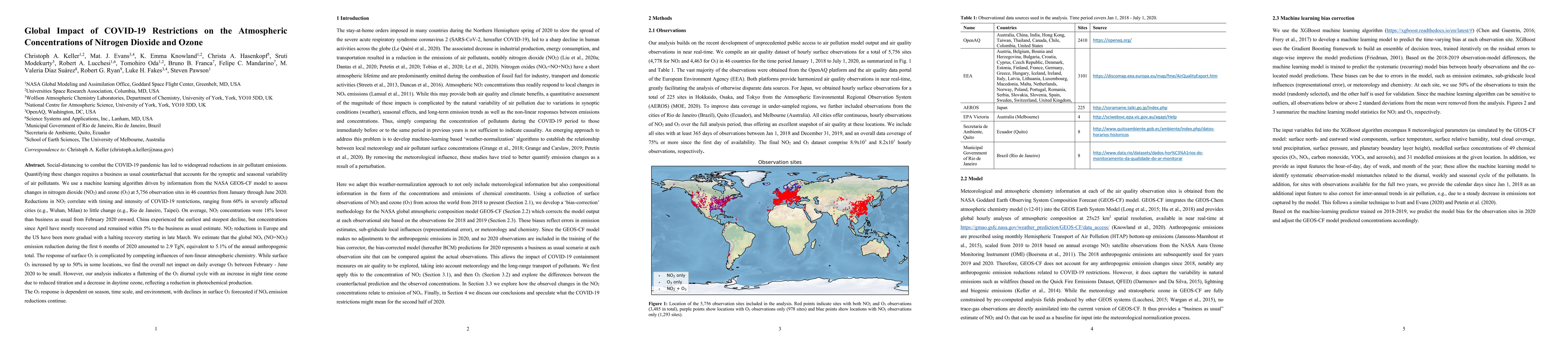 Social-distancing to combat the COVID-19 pandemic has led to widespread reductions in air pollutant emissions. Quantifying these changes requires a business as usual counterfactual that accounts for the synoptic and seasonal variability of air pollutants. We use a machine learning algorithm driven by information from the NASA GEOS-CF model to assess changes in nitrogen dioxide (NO$_{2}$) and ozone (O$_{3}$) at 5,756 observation sites in 46 countries from January through June 2020. Reductions in NO$_{2}$ correlate with timing and intensity of COVID-19 restrictions, ranging from 60% in severely affected cities (e.g., Wuhan, Milan) to little change (e.g., Rio de Janeiro, Taipei). On average, NO$_{2}$ concentrations were 18% lower than business as usual from February 2020 onward. China experienced the earliest and steepest decline, but concentrations since April have mostly recovered and remained within 5% to the business as usual estimate. NO$_{2}$ reductions in Europe and the US have been more gradual with a halting recovery starting in late March. We estimate that the global NO$_{x}$ (NO+NO$_{2}$) emission reduction during the first 6 months of 2020 amounted to 2.9 TgN, equivalent to 5.1% of the annual anthropogenic total. The response of surface O$_{3}$ is complicated by competing influences of non-linear atmospheric chemistry. While surface O$_{3}$ increased by up to 50% in some locations, we find the overall net impact on daily average O$_{3}$ between February - June 2020 to be small. However, our analysis indicates a flattening of the O$_{3}$ diurnal cycle with an increase in night time ozone due to reduced titration and a decrease in daytime ozone, reflecting a reduction in photochemical production. The O$_{3}$ response is dependent on season, time scale, and environment, with declines in surface O$_{3}$ forecasted if NO$_{x}$ emission reductions continue.