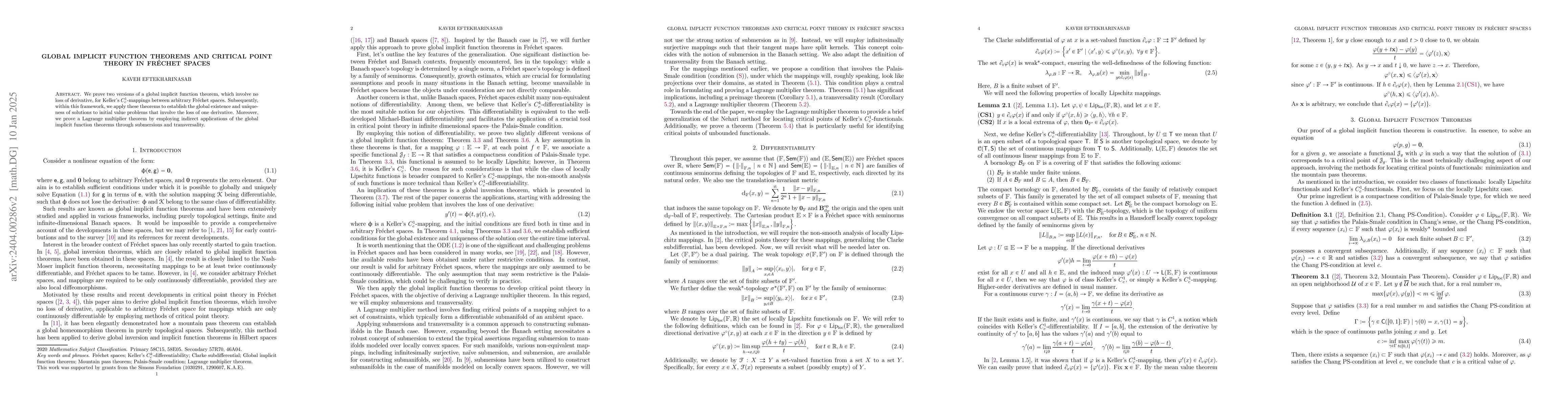 This paper proves two versions of a global implicit function theorem for $C_c^1$ mappings in Fréchet spaces, establishing solution existence and uniqueness without derivative loss. It also demonstrates the application of these theorems to global initial value problems and proves a Lagrange multiplier theorem using transversality and submersions.