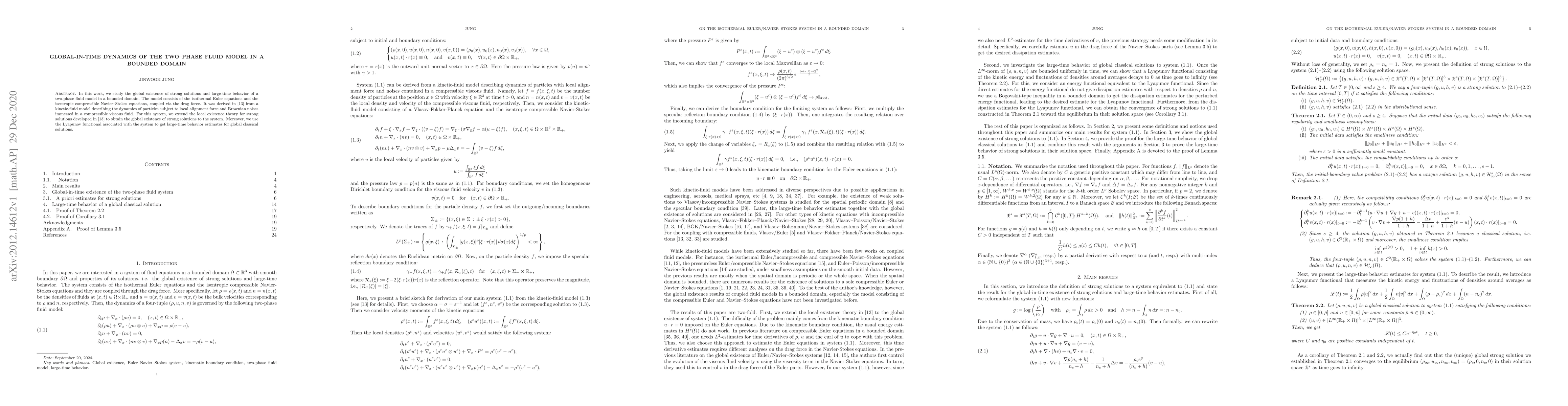 This paper investigates the global existence and long-term behavior of strong solutions for a two-phase fluid model in a bounded domain, combining isothermal Euler and isentropic Navier-Stokes equations coupled by drag force. It extends local existence results to global strong solutions and employs a Lyapunov functional to derive large-time behavior estimates.