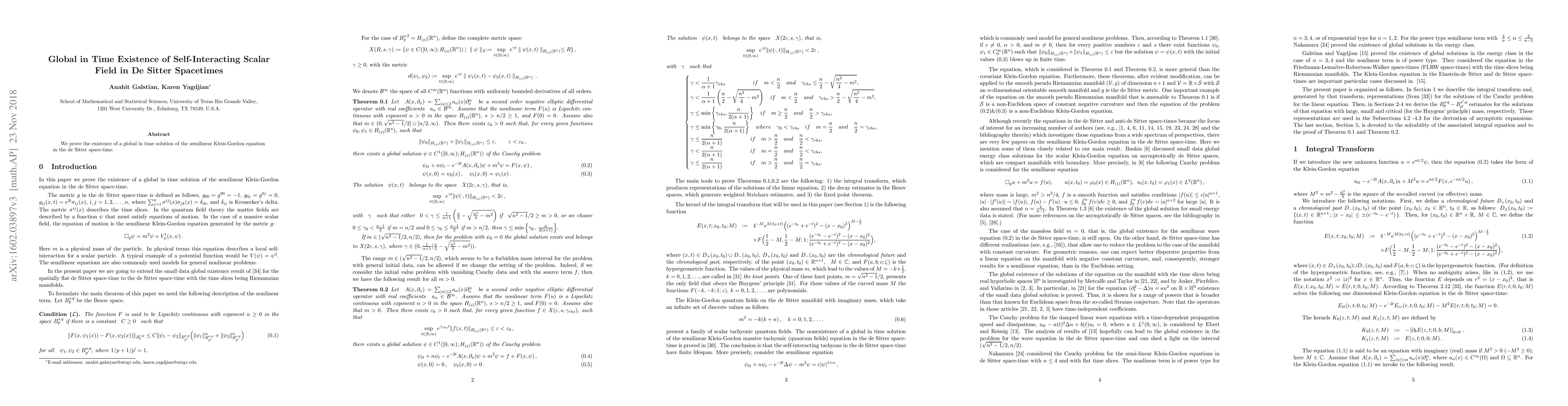 Summary: This paper proves the global in time existence of solutions to the semilinear Klein-Gordon equation within de Sitter spacetimes, demonstrating the viability of self-interacting scalar fields in such cosmological settings.