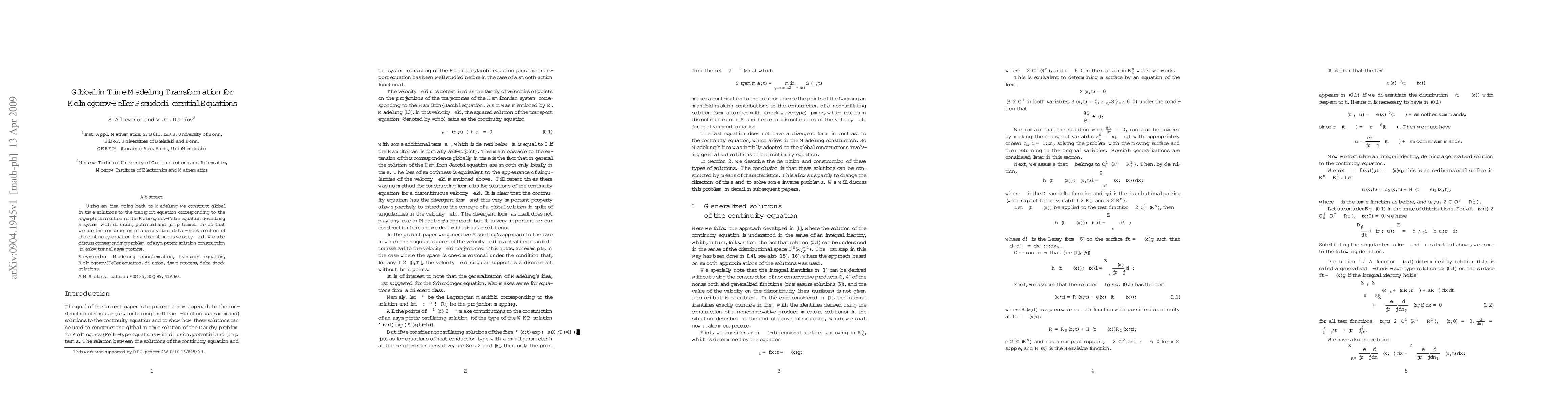 Using an idea going back to Madelung we construct global in time solutions to the transport equation corresponding to the asymptotic solution of the Kolmogorov-Feller equation describing a system with diffusion, potential and jump terms. To do that we use the construction of a generalized delta -shock solution of the continuity equation for a discontinuous velocity field. We also discuss corresponding problem of asymptotic solution construction (Maslov tunnel asymptotics).