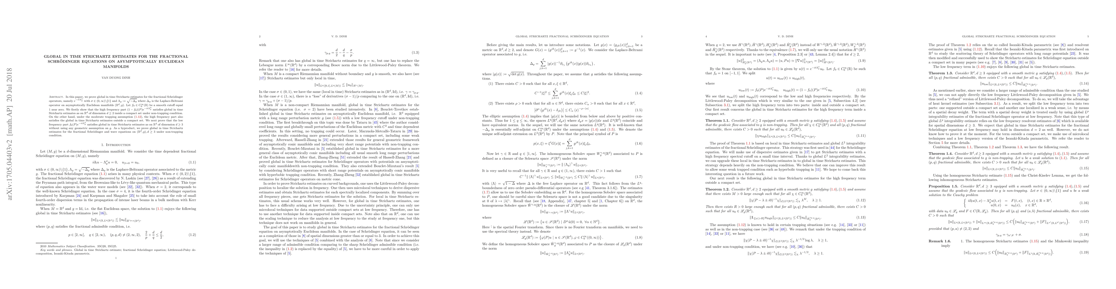 This paper proves global in time Strichartz estimates for fractional Schrödinger operators on asymptotically Euclidean manifolds. The study separates high and low frequency parts, showing respective global estimates under non-trapping and moderate trapping conditions, and establishes similar results for fractional Schrödinger and wave equations in higher dimensions.