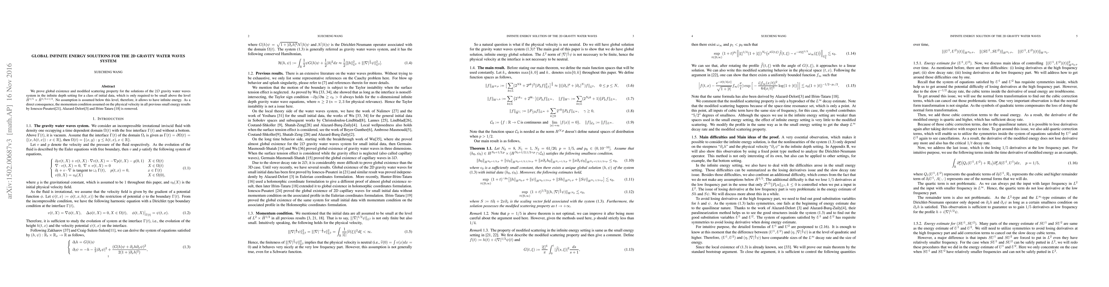 We prove global existence and modified scattering property for the solutions of the $2D$ gravity water waves system in the infinite depth setting for a class of initial data, which is only required to be small above the level $\dot{H}^{1/5}\times \dot{H}^{1/5+1/2}$. No assumption is assumed below this level, therefore, it allows to have infinite energy. As a direct consequence, the momentum condition assumed on the physical velocity in all previous small energy results by Ionescu-Pusateri, Alazard-Delort and Ifrim-Tataru is removed.