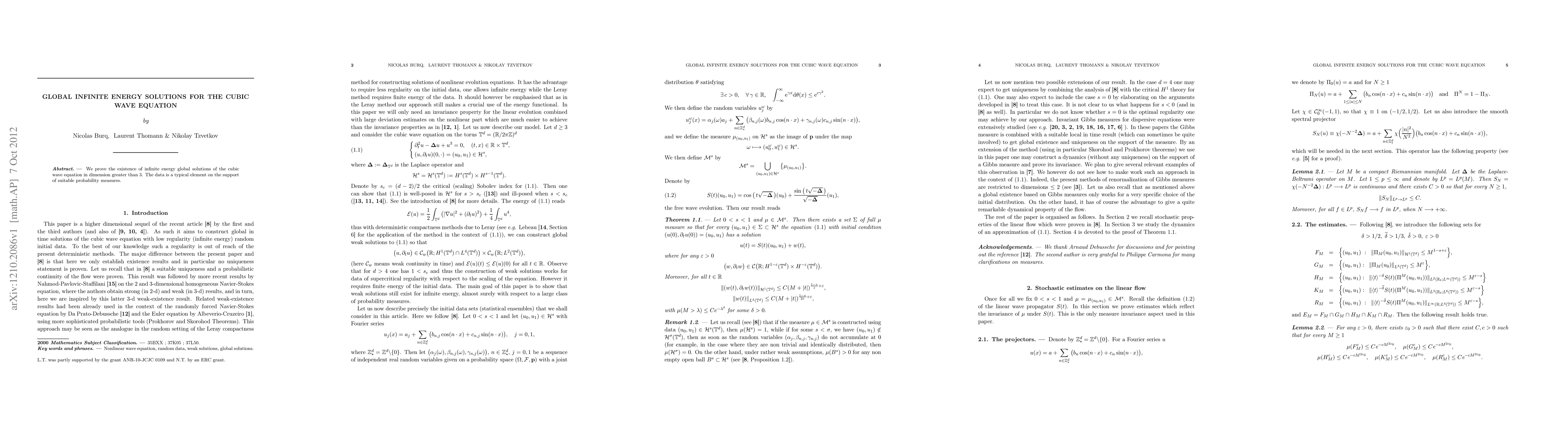Researchers prove existence of infinite energy global solutions for cubic wave equation in dimensions greater than 3, using suitable probability measures to generate data.