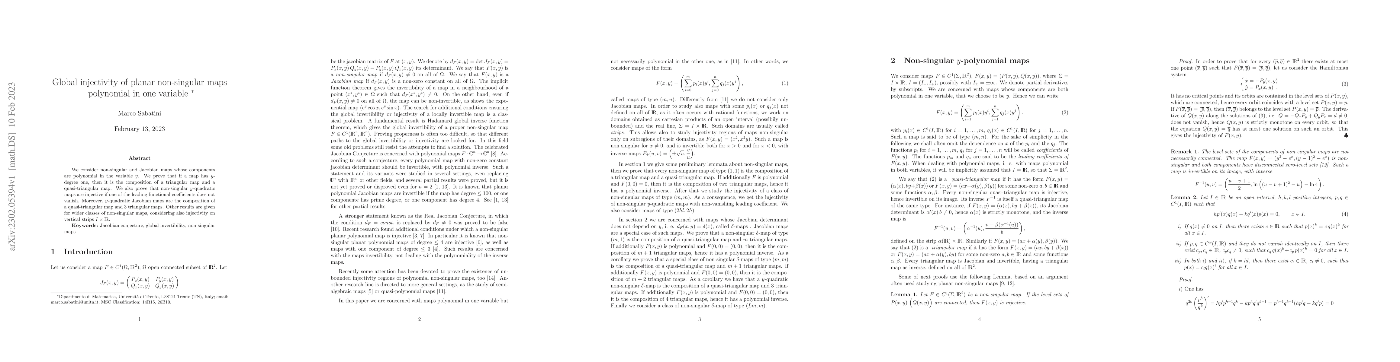 This paper investigates the global injectivity of planar non-singular maps that are polynomial in the variable y. It proves that y-degree one maps decompose into triangular and quasi-triangular components, and establishes injectivity conditions for y-quadratic maps when certain leading coefficients are non-zero.