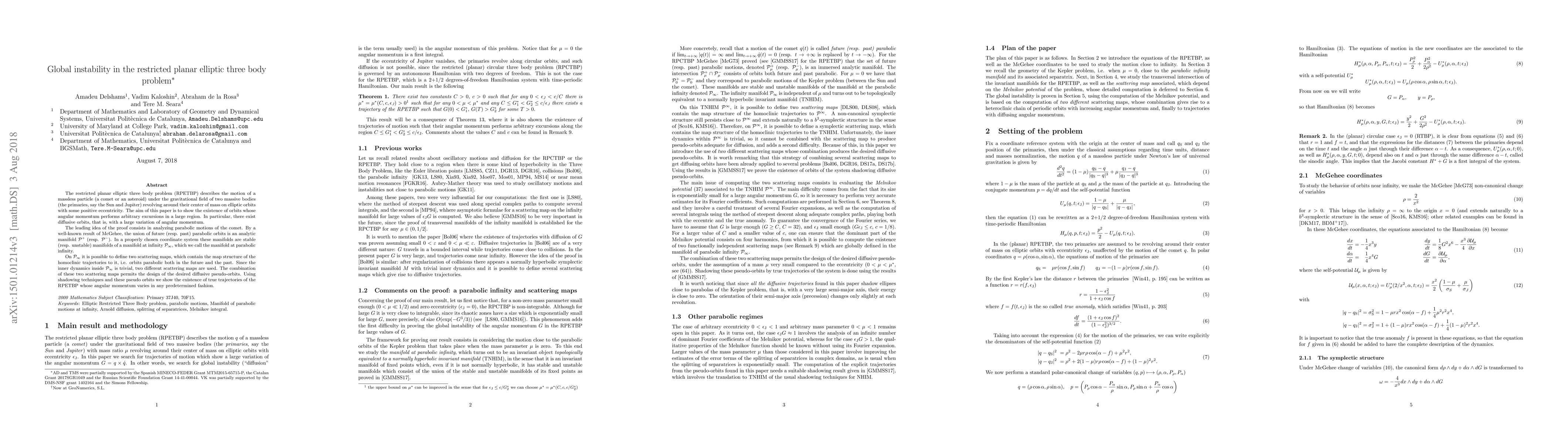 The restricted planar elliptic three body problem (RPETBP) describes the motion of a massless particle (a comet) under the gravitational field of two massive bodies (the primaries, say the Sun and Jupiter) revolving around their center of mass on elliptic orbits with some positive eccentricity. The aim of this paper is to show the existence of orbits whose angular momentum performs arbitrary excursions in a large region. In particular, there exist diffusive orbits, that is, with a large variation of angular momentum. The leading idea of the proof consists in analysing parabolic motions of the comet. By a well-known result of McGehee, the union of future (resp. past) parabolic orbits is an analytic manifold. In a properly chosen coordinate system these manifolds are stable (resp. unstable) manifolds of a manifold at infinity $P_\infty$, which we call manifold at parabolic infinity. On this manifold, it is possible to define two scattering maps, which contain the map structure of the homoclinic trajectories to it, i.e. orbits parabolic both in the future and the past. Since the inner dynamics inside $P_\infty$ is trivial, two different scattering maps are used. The combination of these two scattering maps permits the design of the desired diffusive pseudo-orbits. Using shadowing techniques and these pseudo orbits we show the existence of true trajectories of the RPETBP whose angular momentum varies in any predetermined fashion.