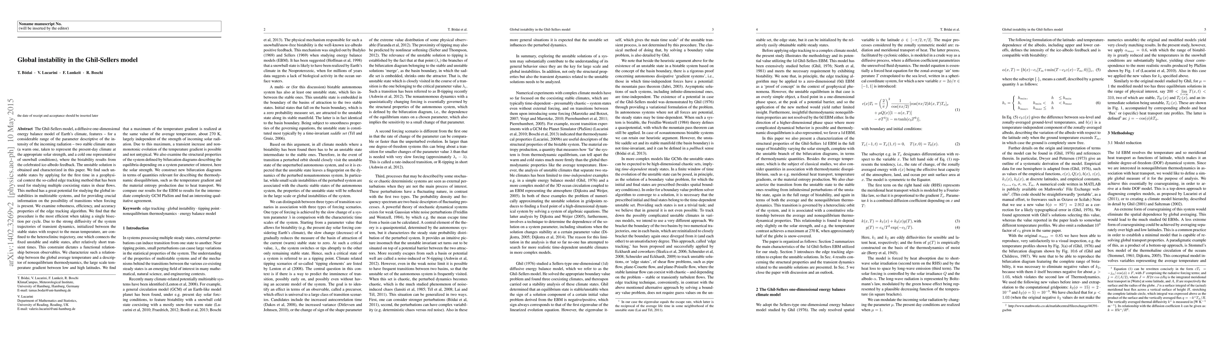 The Ghil-Sellers energy balance model of Earth's climate, features -- for a considerable range of the solar intensity -- two stable climate states (a warm and a cold snowball Earth), where the bistability results from the celebrated ice-albedo feedback. The unstable solution is obtained and characterized in this paper. We find such unstable states by applying for the first time in a geophysical context the so-called edge tracking method that has been used for studying multiple coexisting states in shear flows. We examine robustness, efficiency, and accuracy properties of the edge tracking algorithm. We find that the procedure is the most efficient when taking a single bisection per cycle. Due to the strong diffusivity of the system trajectories of transient dynamics, initialized between the stable states with respect to the mean temperature, are confined to the heteroclininc trajectory, one which connects the fixed unstable and stable states, after relatively short transient times. This constraint dictates a functional relationship between observables. We characterize such a relationship between the global average temperature and a descriptor of nonequilibrium thermodynamics, the large scale temperature gradient between low and high latitudes. We find that a maximum of the temperature gradient is realized at the same value of the average temperature, about 270 K, largely independent of the strength of incoming solar radiation. We also examine the structural properties of the system defined by the equilibria depending on the solar strength. We construct new bifurcation diagrams in terms of quantities relevant for describing the thermodynamic disequilibrium, such as the temperature gradient and the material entropy production due to heat transport. We compare our results for the EBM to results for the intermediate complexity GCM PlaSim and find an interesting qualitative agreement.
