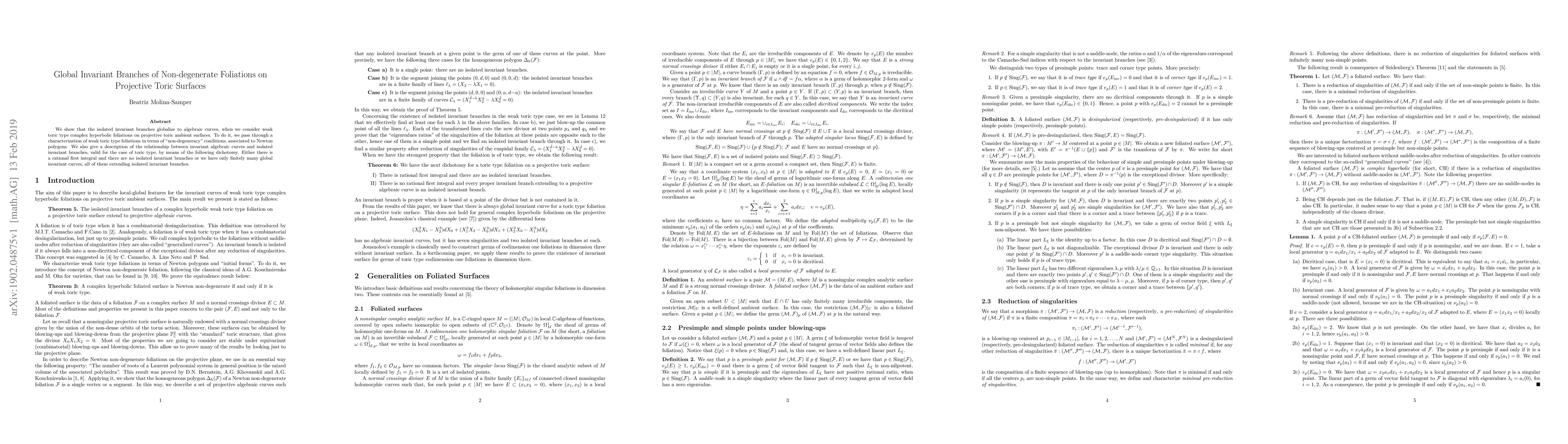 This paper demonstrates that isolated invariant branches of weak toric type complex hyperbolic foliations on projective toric surfaces globalize to algebraic curves. It characterizes these foliations via "non-degeneracy" conditions linked to Newton polygons, and establishes a dichotomy between rational first integrals and the existence of finitely many global invariant curves extending isolated branches.