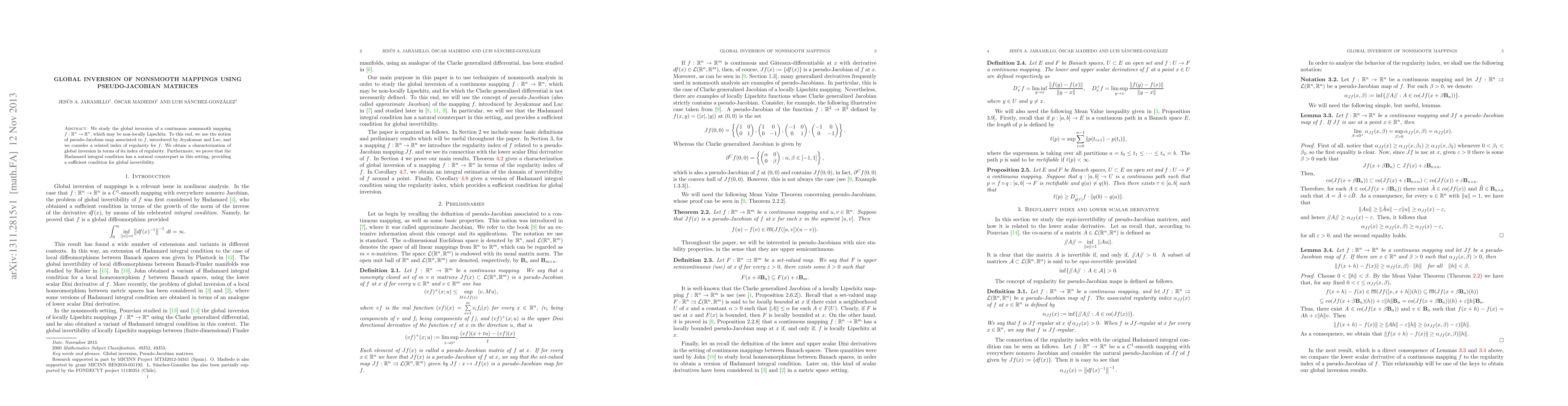 This paper investigates the global inversion of continuous nonsmooth mappings using pseudo-Jacobian matrices, introducing an index of regularity to characterize global invertibility and proving a sufficient condition for it based on the Hadamard integral condition.