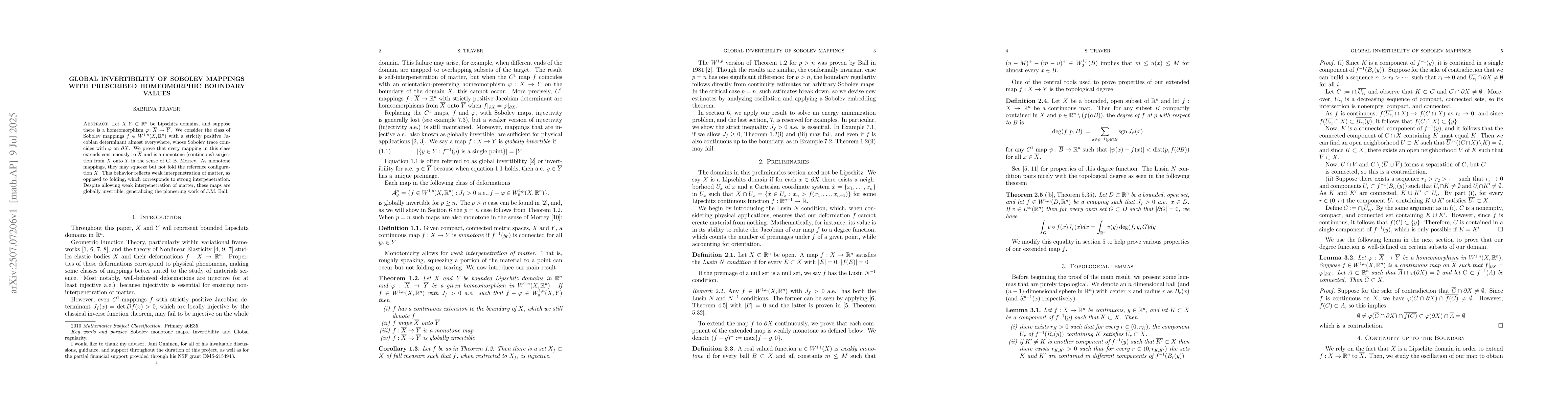 Let $X, Y \subset \mathbb{R}^n$ be Lipschitz domains, and suppose there is a homeomorphism $\varphi \colon \overline{X} \to \overline{Y}$. We consider the class of Sobolev mappings $f \in W^{1,n} (X, \mathbb{R}^n)$ with a strictly positive Jacobian determinant almost everywhere, whose Sobolev trace coincides with $\varphi$ on $\partial X$. We prove that every mapping in this class extends continuously to $\overline{X}$ and is a monotone (continuous) surjection from $\overline{X}$ onto $\overline{Y}$ in the sense of C.B. Morrey. As monotone mappings, they may squeeze but not fold the reference configuration $X$. This behavior reflects weak interpenetration of matter, as opposed to folding, which corresponds to strong interpenetration. Despite allowing weak interpenetration of matter, these maps are globally invertible, generalizing the pioneering work of J.M. Ball.