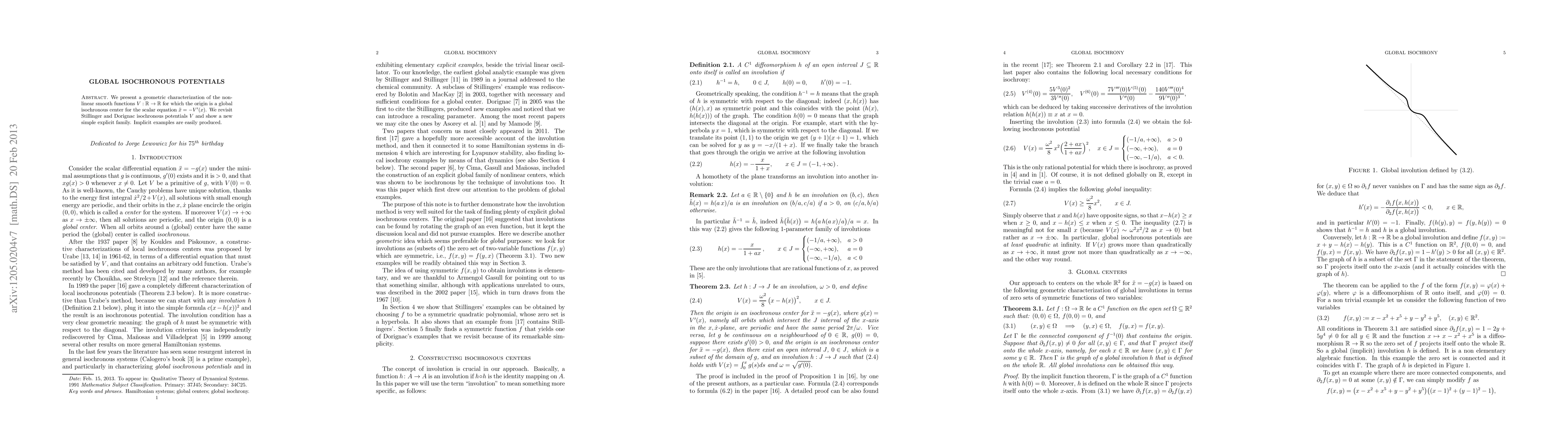 We present a geometric characterization of the nonlinear smooth functions $V: R\to R$ for which the origin is a global isochronous center for the scalar equation $\ddot x=-V'(x)$. We revisit Stillinger and Dorignac isochronous potentials $V$ and show a new simple explicit family. Implicit examples are easily produced.
